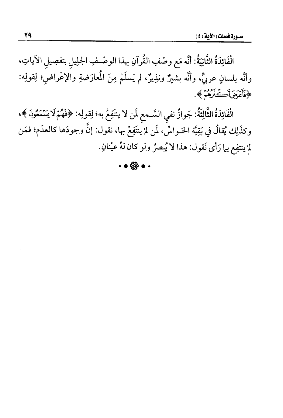 الْفَائِدَةُ الثَّانِيَةُ: أنه مَع وصْفِ القُرآنِ بهذا الوصْفِ الجلِيلِ بتفصِيلِ الآياتِ، وأنه بلسانٍ عربيٍّ، وأنَّه بشيرٌ ونذِيرٌ، لم يَسلَمْ مِنَ المُعارَضةِ والإعْراضِ؛ لِقولِه: {فَأَعْرَضَ أَكْثَرُهُمْ}.