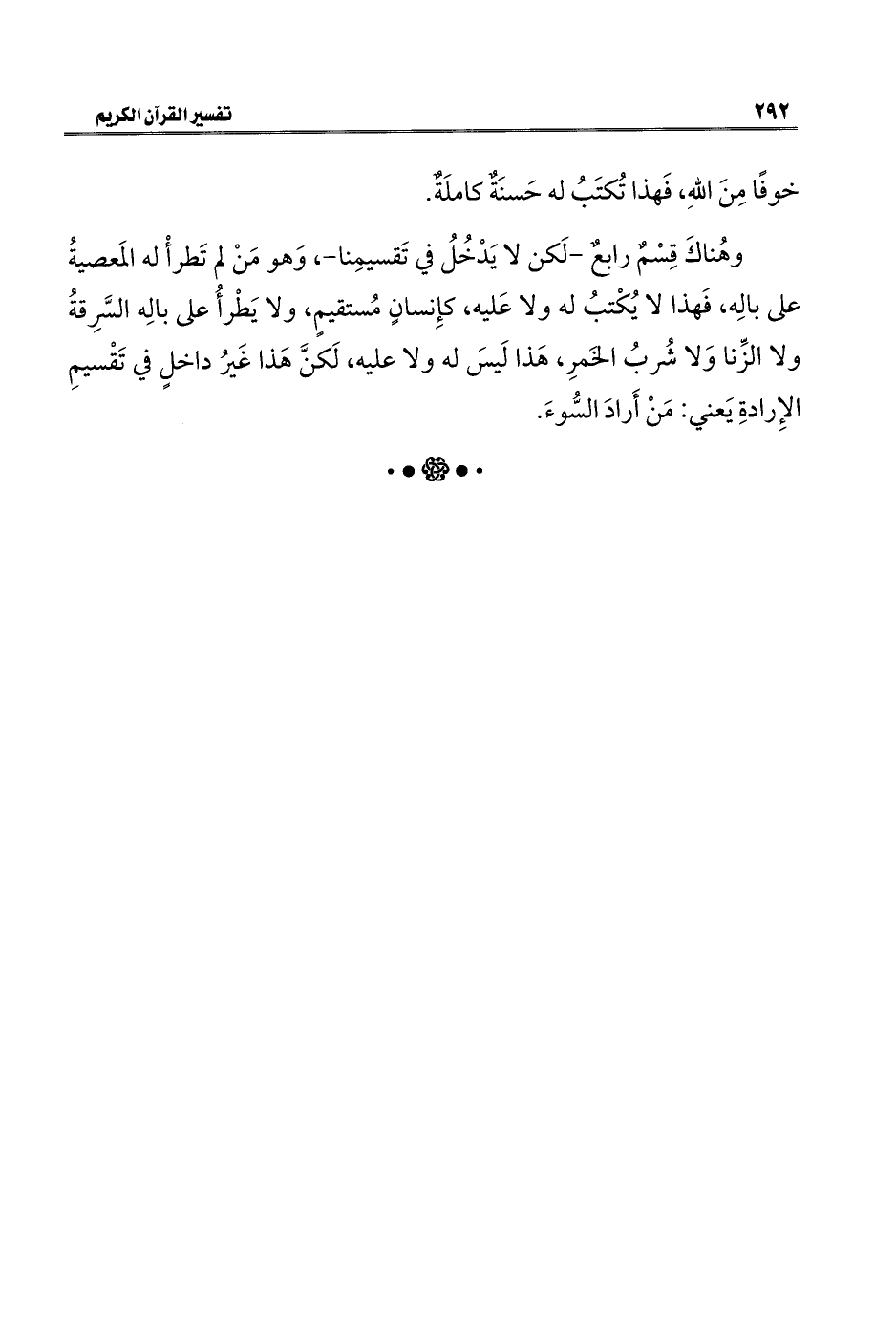 وهُناكَ قِسْمٌ رابعٌ - لَكن لا يَدْخُلُ في تَقسيمِنا -، وَهو مَنْ لم تَطرأْ له المَعصيةُ على بالِه، فَهذا لا يُكْتبُ له ولا عَليه، كإِنسانٍ مُستقيمٍ، ولا يَطْرأُ على بالِه السَّرِقةُ ولا الزِّنا وَلا شُربُ الخَمرِ، هَذا لَيسَ له ولا عليه، لَكنَّ هَذا غَيرُ داخلٍ في تَقْسيمِ الإِرادةِ يَعني: مَنْ أَرادَ السُّوءَ.