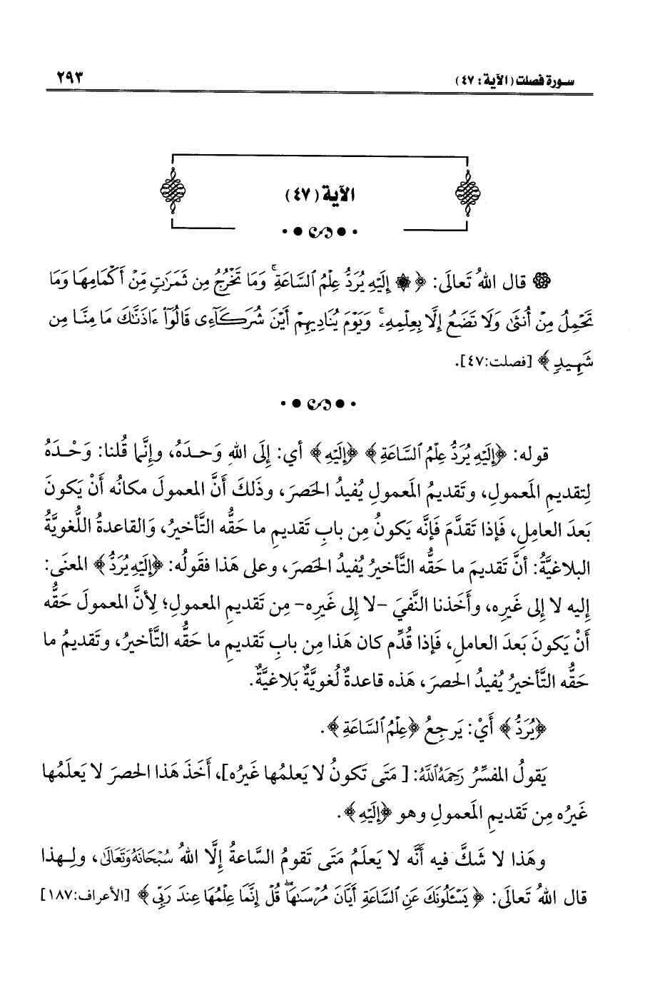 قوله: {إِلَيْهِ يُرَدُّ عِلْمُ السَّاعَةِ} {إِلَيْهِ} أي: إِلَى اللهِ وَحدَهُ، وإِنَّما قُلنا: وَحْدَهُ لِتقديمِ المَعمولِ، وتَقديمُ المَعمولِ يُفيدُ الحَصرَ، وذَلكَ أَنَّ المعمولَ مكانُه أَنْ يَكونَ بَعدَ العامِلِ، فَإذا تَقدَّمَ فَإنَّه يَكونُ مِن بابِ تَقديمِ ما حَقُّه التَّأخيرُ، وَالقاعدةُ اللُّغويَّةُ البلاغيَّةُ: أنَّ تَقديمَ ما حَقُّه التَّأخيرُ يُفيدُ الحَصرَ، وعلى هَذا فقَولُه: {إِلَيْهِ يُرَدُّ} المعنَى: إِليه لا إِلى غَيرِه، وأَخَذنا النَّفيَ - لا إِلى غَيرِه - مِن تَقديمِ المعمولِ؛ لِأنَّ المعمولَ حَقُّه أَنْ يَكونَ بَعدَ العاملِ، فَإذا قُدِّم كان هَذا مِن بابِ تَقديمِ ما حَقُّه التَّأخيرُ، وتَقديمُ ما حَقُّه التَّأخيرُ يُفيدُ الحصرَ، هَذه قاعدةٌ لُغويَّةٌ بَلاغيَّةٌ.