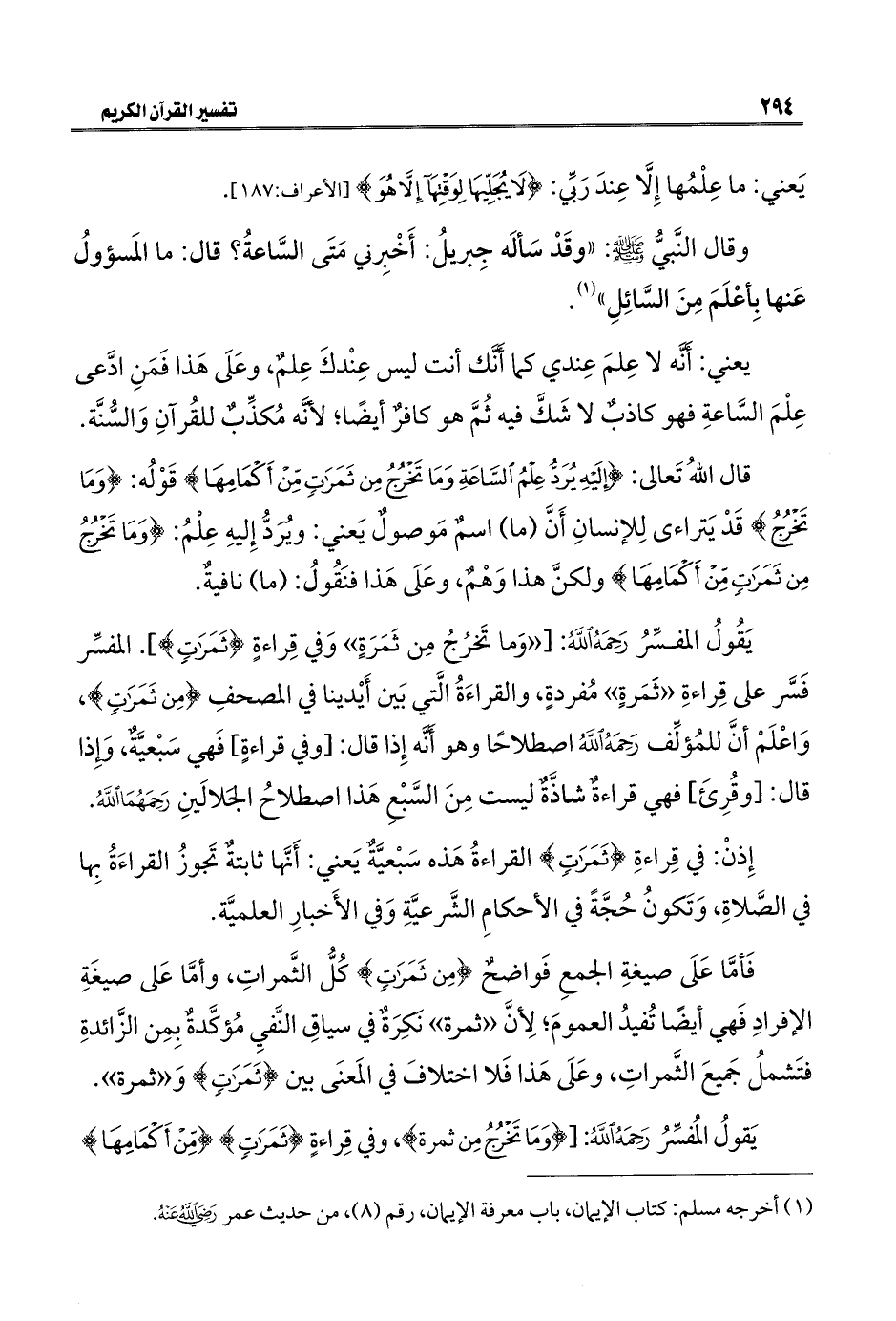 يَقولُ المُفسِّرُ - رَحِمَهُ اللهُ -: [{وَمَا تَخْرُجُ مِنْ ثمرة}، وفي قِراءةٍ {ثَمَرَاتٍ} {مِنْ أَكْمَامِهَا}