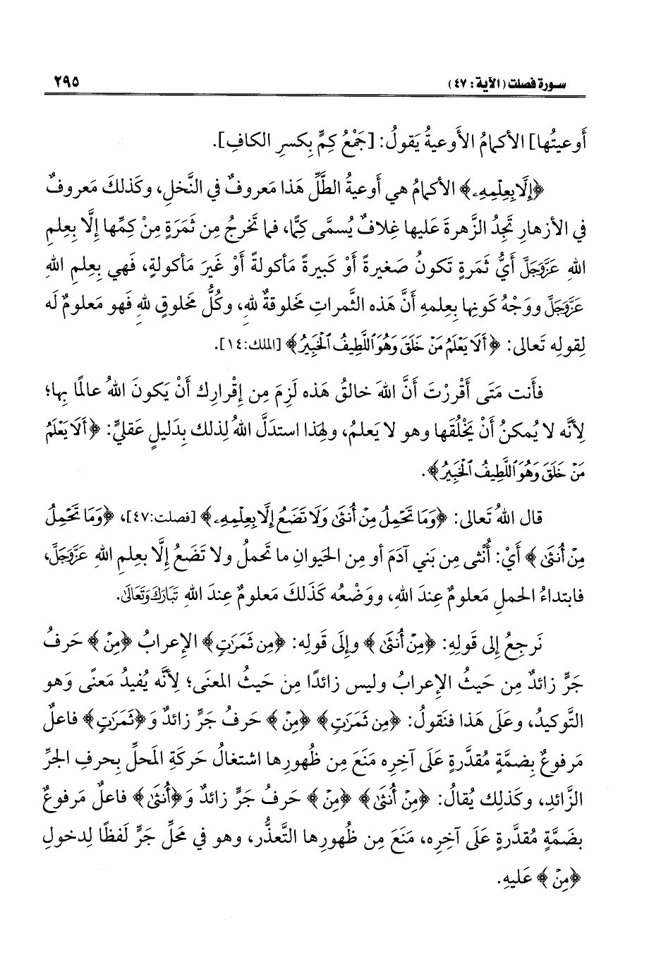 {إِلَّا بِعِلْمِهِ} الأكمامُ هي أَوعيةُ الطَّلِّ هَذا مَعروفٌ في النَّخلِ، وكَذلكَ مَعروفٌ في الأزهارِ تَجِدُ الزَّهرةَ عَليها غِلافٌ يُسمَّى كِمًّا، فما تَخرجُ مِن ثَمَرَةٍ مِنْ كِمِّها إِلَّا بِعِلمِ اللهِ - عَزَّ وَجَلَّ - أَيُّ ثَمَرةٍ تَكونُ صَغيرةً أَوْ كَبيرةً مَأكولةً أَوْ غَيرَ مَأكولةٍ، فَهي بِعِلمِ اللهِ - عَزَّ وَجَلَّ - ووَجْهُ كَونِها بِعِلمهِ أَنَّ هَذه الثَّمراتِ مَخلوقةٌ للهِ، وكُلُّ مَخلوقٍ للهِ فَهو مَعلومٌ لَه لِقولِه تَعالى: {أَلَا يَعْلَمُ مَنْ خَلَقَ وَهُوَ اللَّطِيفُ الْخَبِيرُ} [الملك: ١٤].