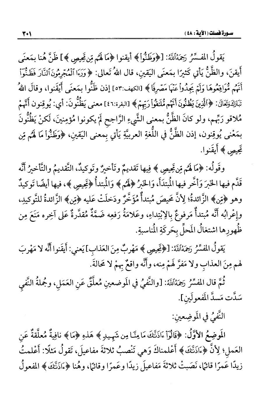 يَقولُ المفسِّرُ - رَحِمَهُ اللهُ -: [{وَظَنُّوا} أيقنوا {مَا لَهُمْ مِنْ مَحِيصٍ} ظَنَّ هُنا بمَعنَى أَيقنَ، والظَّنُّ يَأتي كَثيرًا بمَعنَى اليَقينِ، قال اللهُ تَعالى: {وَرَأَى الْمُجْرِمُونَ النَّارَ فَظَنُّوا أَنَّهُمْ مُوَاقِعُوهَا وَلَمْ يَجِدُوا عَنْهَا مَصْرِفًا} [الكهف: ٥٣] إذن ظَنُّوا بمَعنَى أَيْقَنوا، وقالَ اللهُ تَبَارَكَ وَتَعَالَى: {الَّذِينَ يَظُنُّونَ أَنَّهُمْ مُلَاقُو رَبِّهِمْ} [البقرة: ٤٦] معنى يَظُنُّونَ: أي: يُوقِنون أَنَّهمْ مُلاقو رَبِّهم، ولو كانَ الظَّنُّ بمعنى الشَّيءِ الرَّاجحِ لَمْ يكونوا مُؤمِنينَ، لَكنْ يَظُنُّونَ بمَعْنى يُوقِنون، إذن الظَّنُّ في اللُّغةِ العربيَّةِ يَأتي بِمعنى اليَقينِ، {وَظَنُّوا مَا لَهُمْ مِنْ مَحِيصٍ} أَيقَنوا.