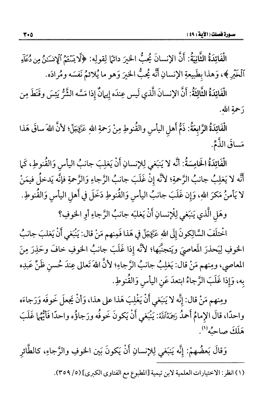الْفَائِدَةُ الخَامِسَةُ: أنَّه لا يَنبَغي لِلإنسانِ أَنْ يَغلِبَ جانبُ اليأسِ وَالقُنوطِ، كَما أَنَّه لا يَغلِبُ جانبُ الرَّحمةِ؛ لأنَّه إِنْ غَلَبَ جانبُ الرَّجاءِ وَالرَّحمةِ فإنَّه يَدخلُ فيمَنْ لا يَأمنُ مَكرَ اللهِ، وَإِن غَلَبَ جانبُ اليأسِ وَالقُنوطِ دَخَلَ في أَهلِ اليأسِ وَالقُنوطِ.