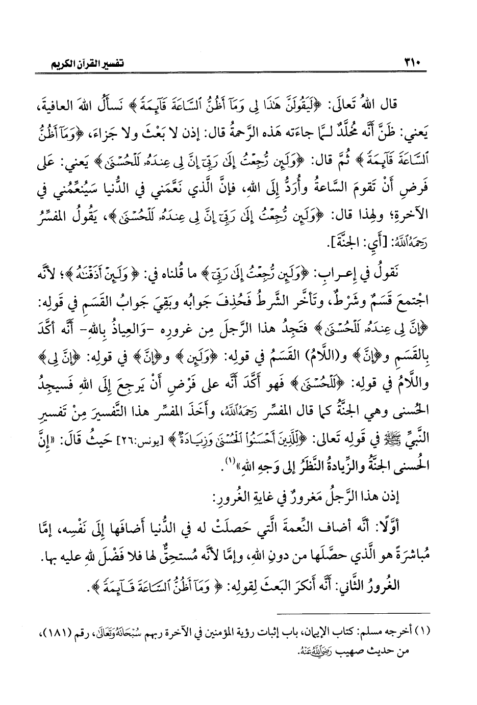 نَقولُ في إِعرابِ: {وَلَئِنْ رُجِعْتُ إِلَى رَبِّي} ما قُلناه في: {وَلَئِنْ أَذَقْنَاهُ}؛ لأنَّه اجْتمعَ قَسَم وشَرْطٌ، وتَأخَّر الشَّرطُ فَحُذِفَ جَوابُه وبَقِيَ جَوابُ القَسَمِ في قَولِه: {إِنَّ لِي عِنْدَهُ لَلْحُسْنَى} فتَجِدُ هذا الرَّجلَ مِن غرورِه -وَالعِياذُ بِاللهِ- أَنَّه أكَّدَ بِالقَسَمِ و {إِنَّ} و (اللَّامُ) القَسَمُ في قولِه: {وَلَئِنْ} و {إِنَّ} في قولِه: {إِنَّ لِي} واللَّامُ في قولِه: {لَلْحُسْنَى} فَهو أَكَّدَ أَنَّه علي فَرْضِ أَنْ يَرجِعَ إِلَي اللهِ فَسيجِدُ الحُسنى وهي الجنَّةُ كما قال المفسِّر رَحِمَهُ اللهُ، وأَخَذَ المفسِّر هذا التَّفسيرَ مِنْ تَفسيرِ النَّبيِّ - صلى الله عليه وسلم - في قَولِه تَعالى: {لِلَّذِينَ أَحْسَنُوا الْحُسْنَى وَزِيَادَةٌ} [يونس: ٢٦] حَيثُ قَالَ: "إِنَّ الحُسنى الجنَّةُ والزِّيادةُ النَّظَرُ إلي وَجهِ اللهِ" (¬١).