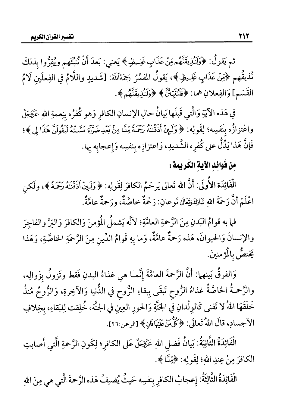 الْفَائِدَة الأُولَى: أَنَّ الله تَعالى يَرحَم الكافرَ لِقَولِه: {وَلَئِنْ أَذَقْنَاهُ رَحْمَةً}، ولَكنِ اعْلَمْ أنَّ رَحمَةَ اللهِ تَبَارَكَ وَتَعَالَى نَوعانِ: رَحْمةٌ خاصَّةٌ، ورَحمة عامَّةٌ.