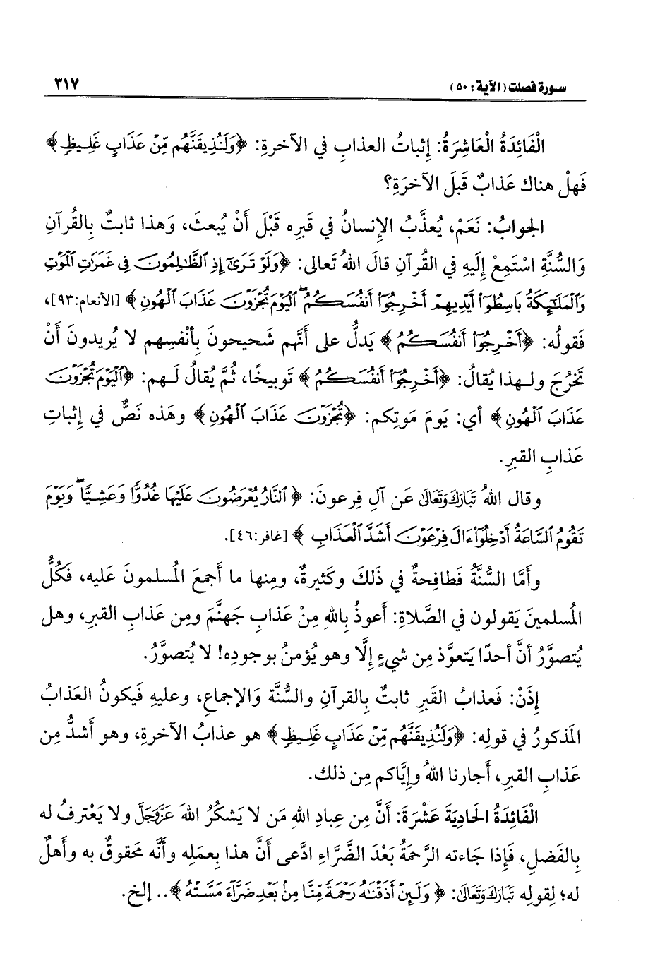 وأَمَّا السُّنَّةُ فَطافِحةٌ في ذَلكَ وكَثيرةٌ، ومِنها ما أَجمعَ المُسلمونَ عَليه، فَكُلُّ المُسلمينَ يَقولون في الصَّلاةِ: أَعوذُ بِاللهِ مِنْ عَذابِ جَهنَّمَ ومِن عَذابِ القبرِ، وهل يُتصوَّرُ أنَّ أحدًا يَتعوَّذ مِن شيءٍ إِلَّا وهو يُؤمنُ بوجودِه! لا يُتصوَّرُ.