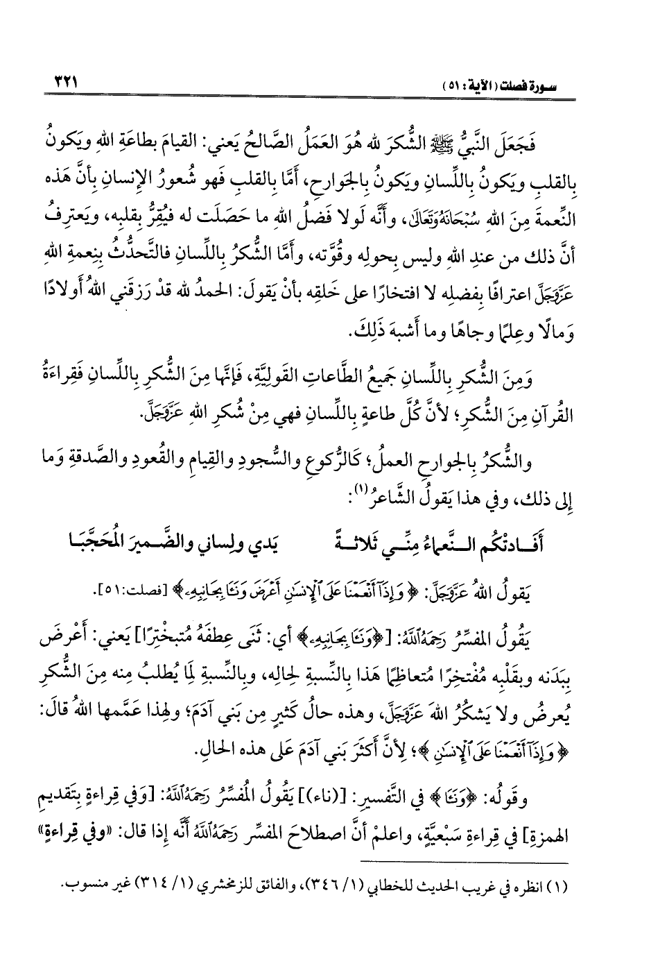 يَقُولُ المفسِّرُ رَحِمَهُ اللهُ: [{وَنَأَى بِجَانِبِهِ} أي: ثَنَي عِطفَهُ مُتبخْتِرًا] يَعني: أَعْرضَ بِبَدَنه وبقَلْبِه مُفْتخِرًا مُتعاظِمًا هَذا بِالنِّسبةِ لحِالِه، وبِالنِّسبةِ لمِا يُطلبُ مِنه مِنَ الشُّكرِ يُعرضُ ولا يَشكُرُ اللهَ عَزَّ وَجَلَّ، وهذه حالُ كَثيرٍ مِن بَني آدَمَ؛ ولهِذا عَمَّمها اللهُ قالَ: {وَإِذَا أَنْعَمْنَا عَلَى الْإِنْسَانِ} لِأنَّ أَكثَرَ بَني آدَمَ عَلى هذه الحالِ.