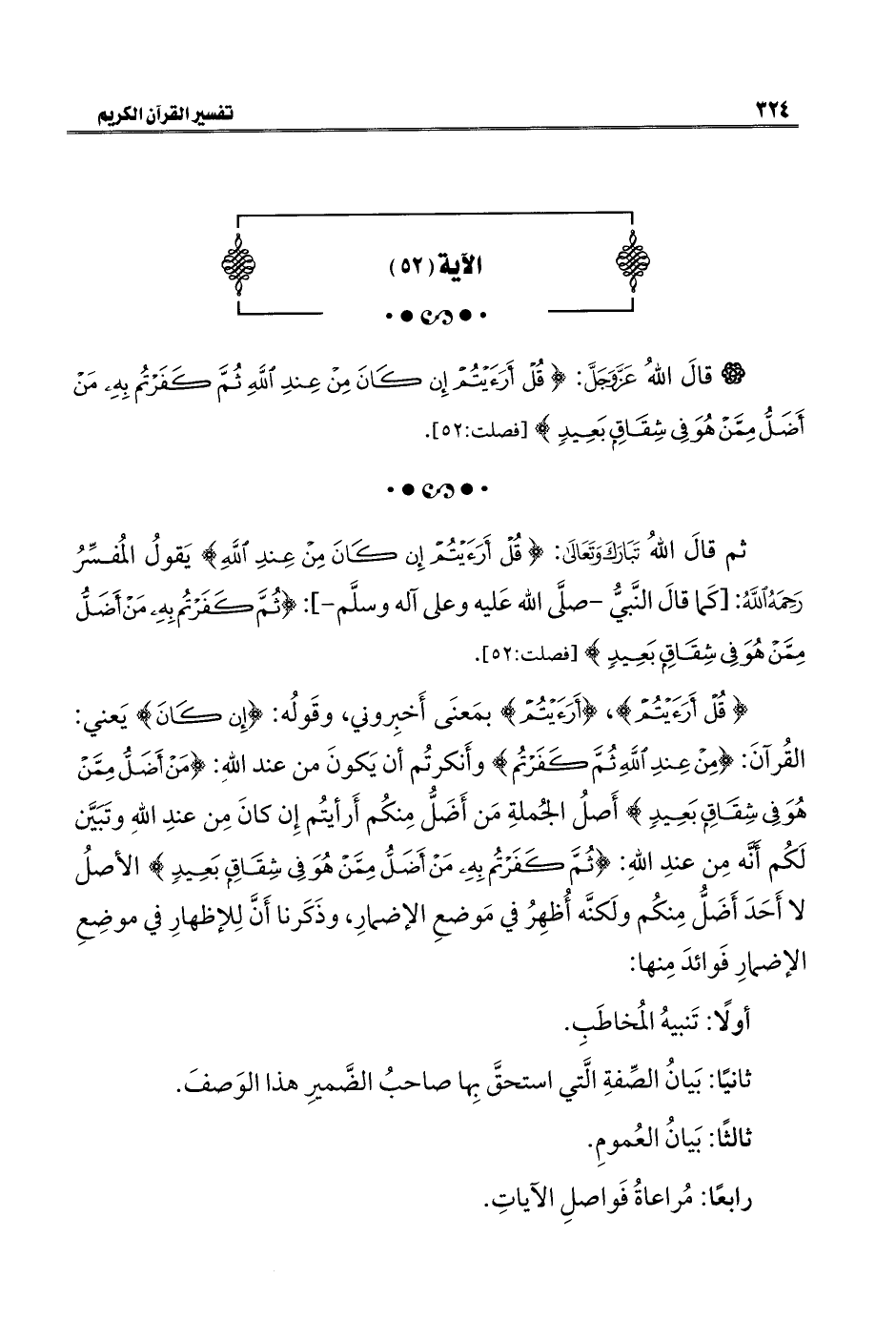 {قُلْ أَرَأَيْتُمْ}، {أَرَأَيْتُمْ} بمَعنَي أَخبِروني، وقَولُه: {إِنْ كَانَ} يَعني: القُرآنَ: {مِنْ عِنْدِ اللَّهِ ثُمَّ كَفَرْتُمْ} وأَنكرتُم أن يَكونَ من عند اللهِ: {مَنْ أَضَلُّ مِمَّنْ هُوَ فِي شِقَاقٍ بَعِيدٍ} أَصلُ الجُملةِ مَن أَضَلُّ مِنكُم أَرأيتُم إِن كانَ مِن عندِ اللهِ وتَبَيَّن لَكُم أَنَّه مِن عندِ اللهِ: {ثُمَّ كَفَرْتُمْ بِهِ مَنْ أَضَلُّ مِمَّنْ هُوَ فِي شِقَاقٍ بَعِيدٍ} الأصلُ لا أَحَدَ أَضَلُّ مِنكُم ولَكنَّه أُظهِرُ في مَوضعِ الإضمارِ، وذَكَرنا أَنَّ لِلإظهارِ في موضِعِ الإضمارِ فَوائدَ مِنها: