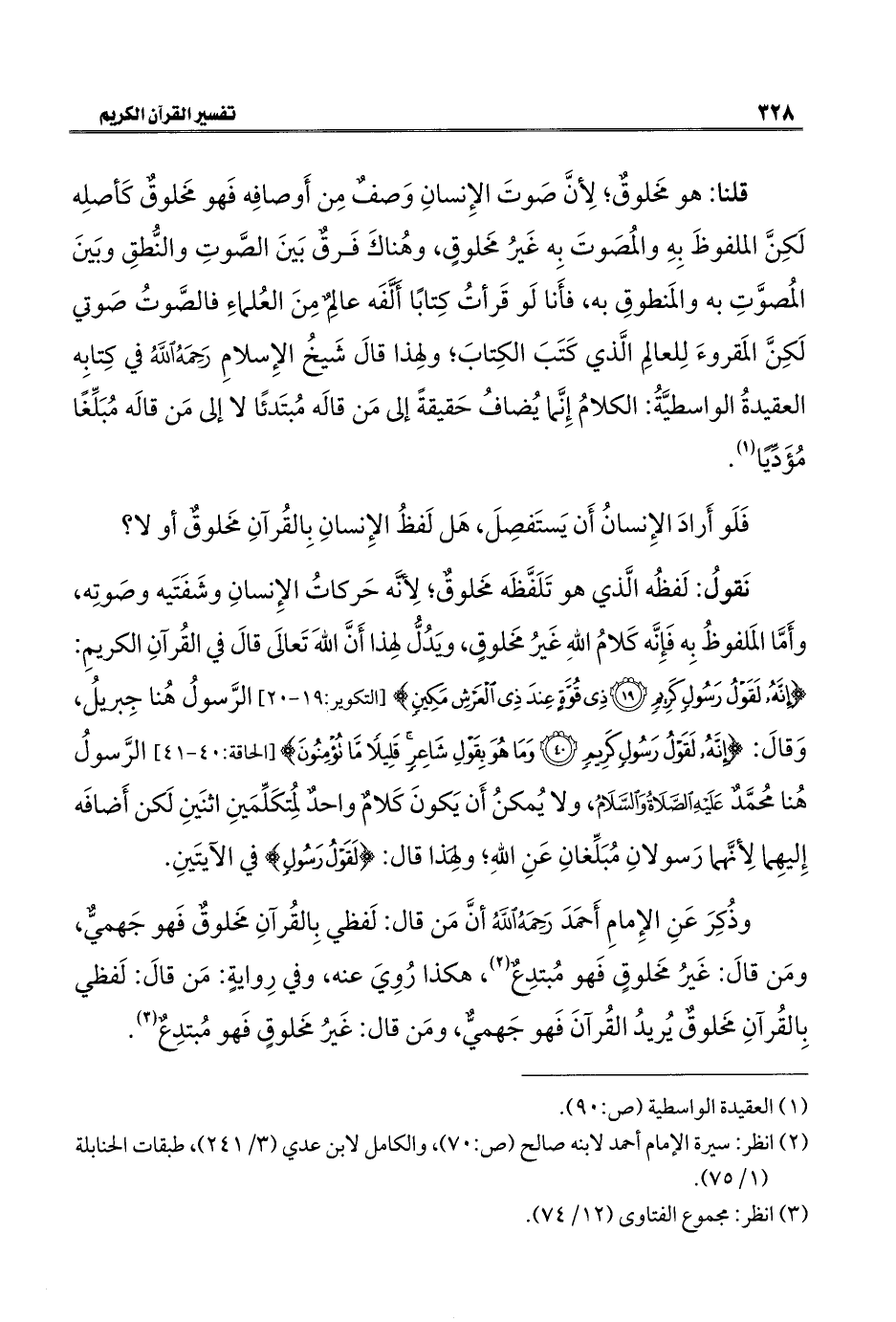 نَقولُ: لَفظُه الَّذي هو تَلَفَّظَه مَخلوقٌ؛ لِأنَّه حَركاتُ الإِنسانِ وشَفَتَيه وصَوتِه، وأَمَّا المَلفوظُ بِه فَإِنَّه كَلامُ اللهِ غَيرُ مخَلوقٍ، وَيدُلُّ لهِذا أَنَّ اللهَ تَعالَي قالَ في القُرآنِ الكريمِ: {إِنَّهُ لَقَوْلُ رَسُولٍ كَرِيمٍ (١٩) ذِي قُوَّةٍ عِنْدَ ذِي الْعَرْشِ مَكِينٍ (٢٠)} [التكوير: ١٩، ٢٠] الرَّسولُ هُنا جِبريلُ، وَقالَ: {إِنَّهُ لَقَوْلُ رَسُولٍ كَرِيمٍ (٤٠) وَمَا هُوَ بِقَوْلِ شَاعِرٍ قَلِيلًا مَا تُؤْمِنُونَ} [الحاقة: ٤٠، ٤١] الرَّسولُ هُنا محُمَّدٌ عَلَيْهِ الصَّلَاةُ وَالسَّلَامُ، ولا يُمكنُ أَن يَكونَ كَلامٌ واحدٌ لمُتكَلِّمَينِ اثنَينِ لَكن أَضافَه إِليهِما لِأنَّهما رَسولانِ مُبَلِّغانِ عَنِ اللهِ؛ ولِهَذا قال: {لَقَوْلُ رَسُولٍ} في الآيتَينِ.
