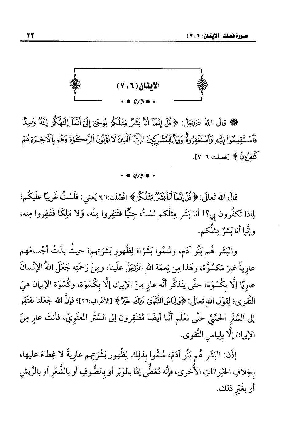 * قالَ اللهُ عَزَّ وجلَّ: {قُلْ إِنَّمَا أَنَا بَشَرٌ مِثْلُكُمْ يُوحَى إِلَيَّ أَنَّمَا إِلَهُكُمْ إِلَهٌ وَاحِدٌ فَاسْتَقِيمُوا إِلَيْهِ وَاسْتَغْفِرُوهُ وَوَيْلٌ لِلْمُشْرِكِينَ (٦) الَّذِينَ لَا يُؤْتُونَ الزَّكَاةَ وَهُمْ بِالْآخِرَةِ هُمْ كَافِرُونَ} [فصلت: ٦ - ٧].