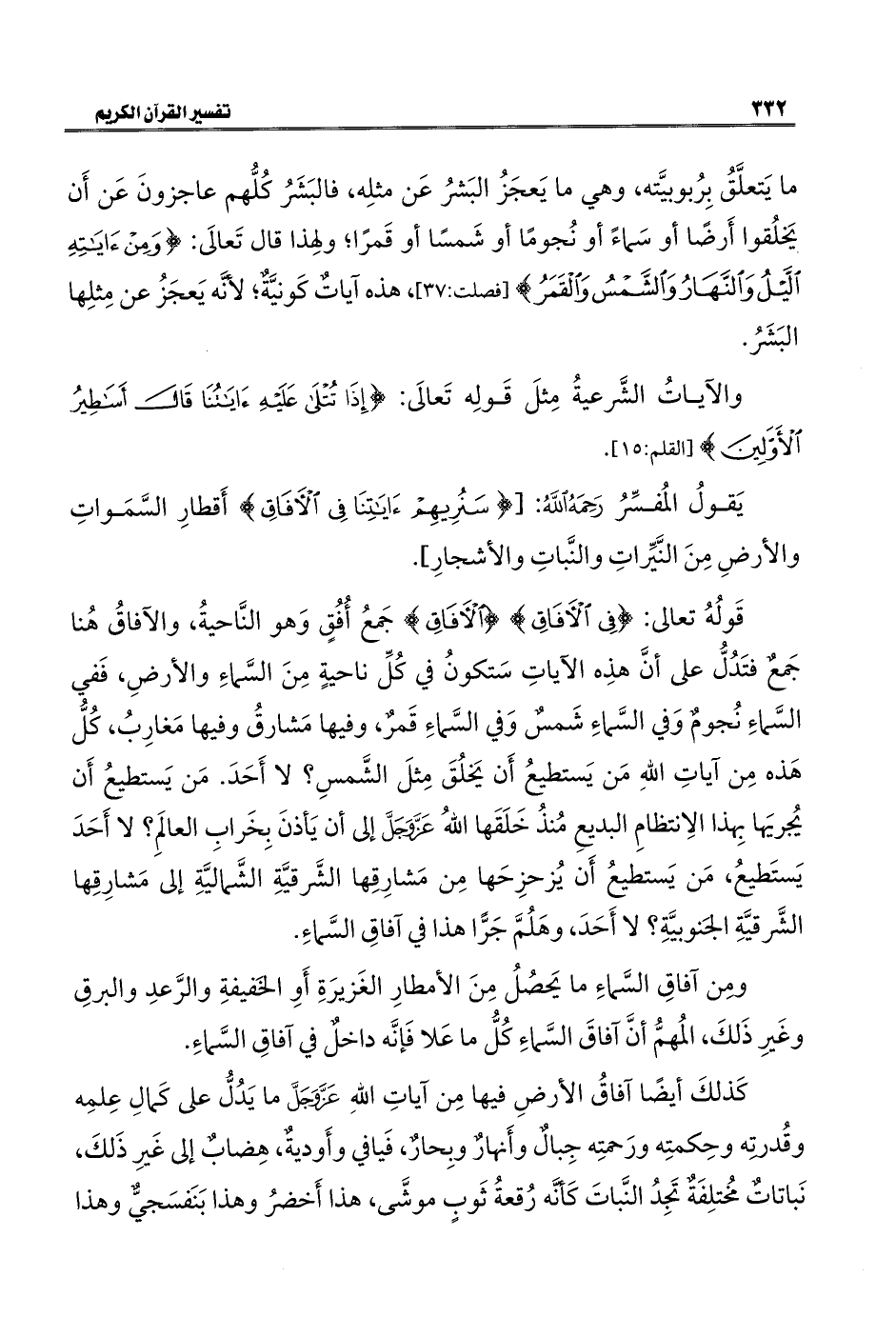 يَقولُ المُفسِّرُ رَحِمَهُ اللهُ: {سَنُرِيهِمْ آيَاتِنَا فِي الْآفَاقِ} أَقطارِ السَّمَواتِ والأرضِ مِنَ النَّيِّراتِ والنَّباتِ والأشجارِ].