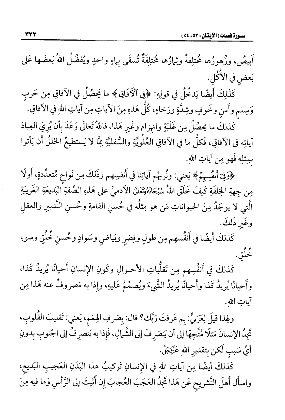 {وَفِي أَنْفُسِهِمْ} يَعني: ونُريهُم آياتِنا في أَنفسِهم وذَلكَ مِن نَواحٍ مُتعدِّدةٍ، أَولًا مِن جِهةِ الخِلقَةِ كَيفَ خَلَقَ اللهُ سُبْحَانَهُ وَتَعَالى الآدميَّ علي هَذهِ الصِّفةِ البَديعَةِ الغَريبَةِ الَّتي لا يوجَدُ مِنَ الحيواناتِ مَن هو مِثلُه في حُسنِ القامةِ وحُسنِ التَّدبيرِ والعقلِ وغَيرِ ذَلكَ.