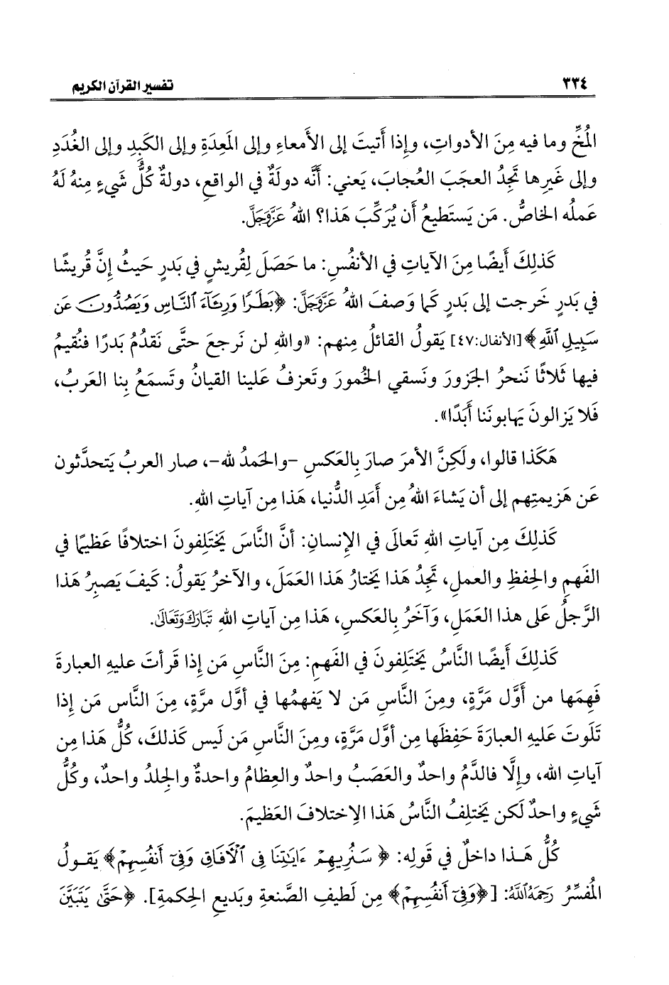 كَذلِكَ أَيضًا مِنَ الآياتِ في الأنفُسِ: ما حَصَلَ لِقُريشٍ في بَدرٍ حَيثُ إِنَّ قُريشًا في بَدرٍ خَرجت إلي بَدرٍ كَما وَصفَ اللهُ عَزَّ وَجَلَّ: {بَطَرًا وَرِئَاءَ النَّاسِ وَيَصُدُّونَ عَنْ سَبِيلِ اللَّهِ} [الأنفال: ٤٧] يَقولُ القائلُ مِنهم: "واللهِ لن نَرجعَ حتَّى نَقدُمُ بَدرًا فنُقيمُ فيها ثَلاثًا نَنحرُ الجَزورَ ونَسقي الخُمورَ وتَعزفُ عَلينا القيانُ وتَسمَعُ بِنا العَربُ، فَلا يَزالونَ يَهابونَنا أَبَدًا".
