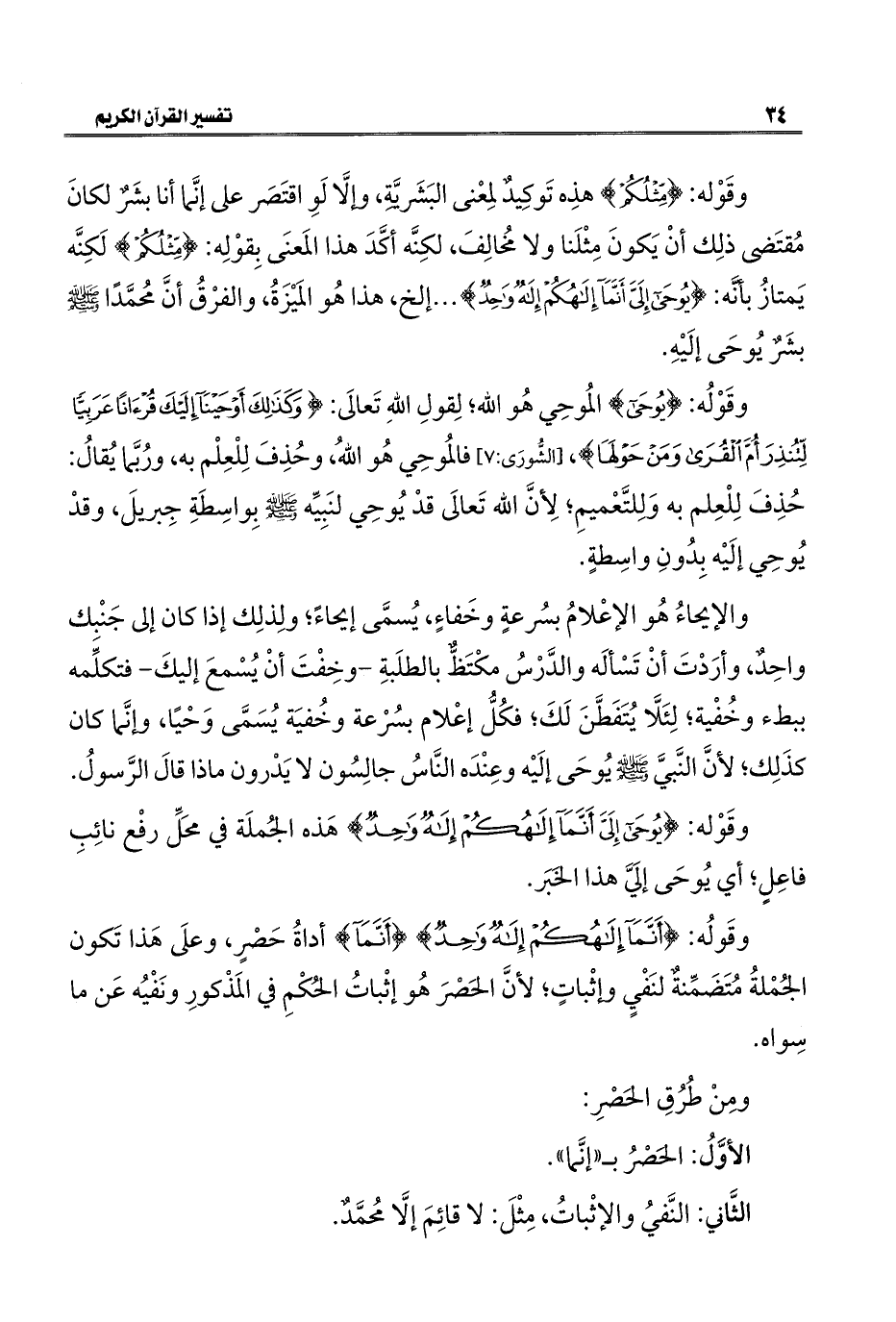 وقَوْله: {مِثْلُكُمْ} هذِه تَوكِيدٌ لمِعْنى البَشَريَّة، وإلَّا لَوِ اقتَصَر على إنَّما أنا بشَرٌ لكانَ مُقتَضى ذلِك أنْ يَكونَ مِثْلَنا ولا مخُالِفَ، لكِنَّه أكَّدَ هذا المَعنَى بِقوْلِه: {مِثْلُكُمْ} لَكِنَّه يَمتازُ بأنه: {يُوحَى إِلَيَّ أَنَّمَا إِلَهُكُمْ إِلَهٌ وَاحِدٌ} ... إلخ، هذا هُو المَيْزَة، والفرْقُ أنَّ محُمَّدًا - صلى الله عليه وسلم - بشَرٌ يُوحَى إلَيْهِ.