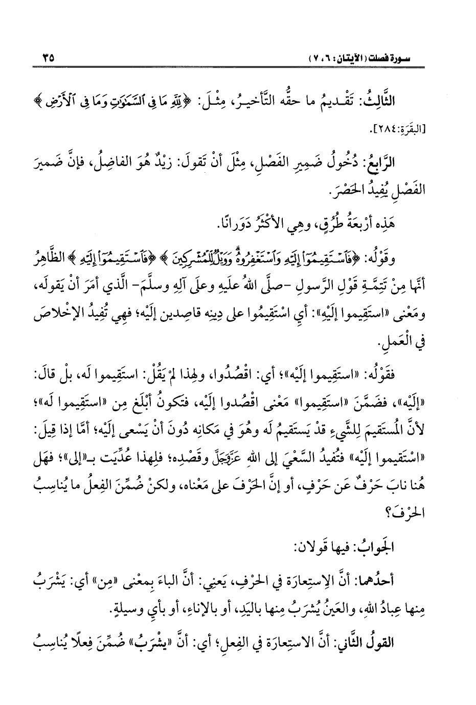 فقَوْلُه: "استَقِيموا إلَيْه"، أي: اقْصُدُوا، ولهِذا لمْ يَقُلْ: استَقِيموا لَه، بلْ قالَ: "إلَيْه"، فضَمَّنَ "استَقِيموا" مَعْنى اقْصُدوا إلَيْه، فتكونُ أبْلَغ مِن "استَقِيموا لَه"، لأنَّ المُستَقيمَ لِلشَّيءِ قدْ يَستَقيمُ لَه وهُوَ في مَكانِه دُونَ أنْ يَسْعى إلَيْه، أمَّا إذا قِيلَ: "اسْتَقيموا إلَيْه" فتُفيدُ السَّعْيَ إلى اللهِ عَزَّ وَجلَّ وقَصْدِه؛ فلِهذا عُدِّيَت بـ"إلى"؛ فهَل هُنا نابَ حَرْفٌ عَن حَرْفٍ، أو إنَّ الحَرْفَ على مَعْناه، ولكنْ ضُمِّنَ الفِعلُ ما يُناسِبُ الحرفَ؟