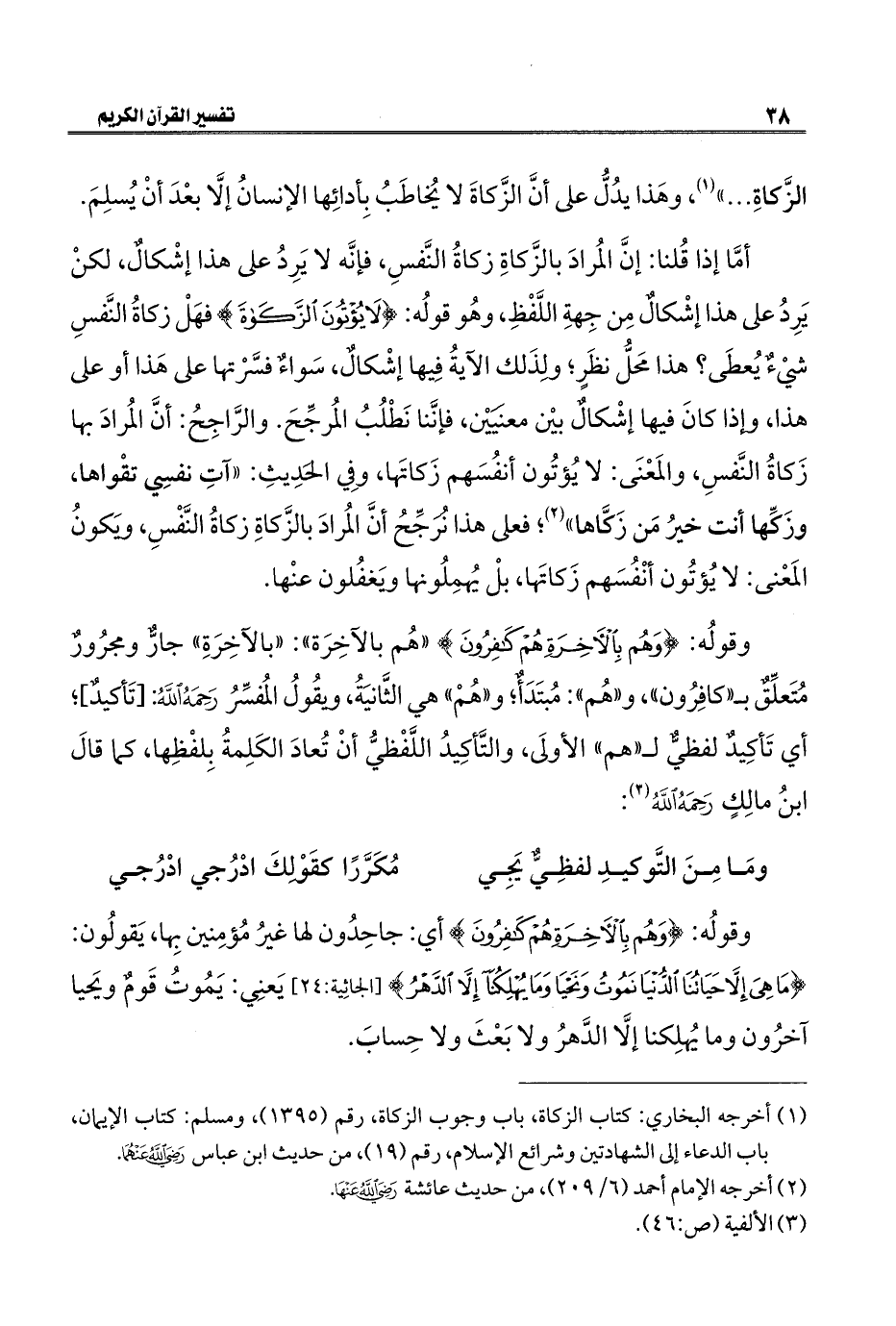 أمَّا إذا قُلنا: إنَّ المُرادَ بالزَّكاةِ زكاةُ النَّفسِ، فإنَّه لا يَرِدُ على هذا إشْكالٌ، لكنْ يَرِدُ على هذا إشكالٌ مِن جِهةِ اللَّفْظِ، وهُو قولُه: {لَا يُؤْتُونَ الزَّكَاةَ} فهَلْ زكاةُ النَّفسِ شيْءٌ يُعطَى؟ هذا محَلُّ نظَرٍ؛ ولذَلك الآيةُ فِيها إشْكالٌ، سَواءٌ فسَّرْتها على هَذا أو على هذا، وإذا كانَ فيها إشْكالٌ بيْن معنيَيْن، فإنَّنا نَطْلُبُ المُرجِّحَ. والرَّاجِحُ: أنَّ المُرادَ بها زَكاةُ النَّفسِ، والمَعْنَى: لا يُؤتُون أنفُسَهم زَكاتَها، وفِي الحَدِيثِ: "آتِ نفسِي تقْواها، وزَكِّها أنت خيرُ مَن زَكَّاها" (¬٢)؛ فعلى هذا نرجِّحُ أنَّ المُرادَ بالزَّكاةِ زكاةُ النَّفْسِ، وَيكونُ المَعْنى: لا يُؤتُون أنْفُسَهم زَكاتَها، بلْ يُهمِلُونها ويَغفُلون عنْها.