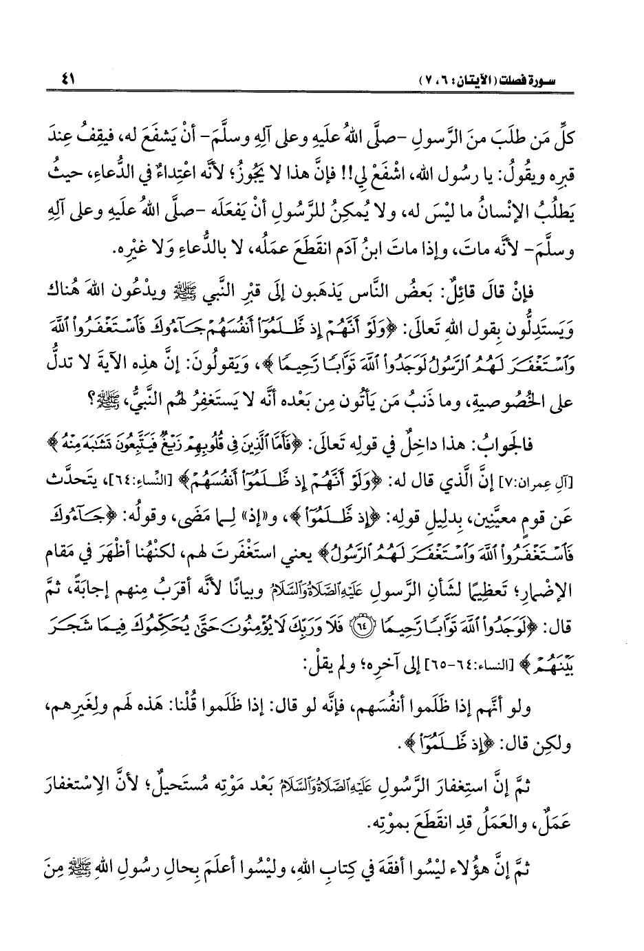 فإنْ قالَ قائِلٌ: بَعضُ النَّاس يَذهَبون إلَى قبْرِ النَّبي - صلى الله عليه وسلم - ويدْعُون اللهَ هُناك وَيَستَدِلُّون بِقول اللهِ تَعالَى: {وَلَوْ أَنَّهُمْ إِذْ ظَلَمُوا أَنْفُسَهُمْ جَاءُوكَ فَاسْتَغْفَرُوا اللَّهَ وَاسْتَغْفَرَ لَهُمُ الرَّسُولُ لَوَجَدُوا اللَّهَ تَوَّابًا رَحِيمًا} , وَيَقولُونَ: إنَّ هذِه الآيةَ لا تدلُّ على الخُصُوصيةِ، وما ذَنبُ مَن يَأتون مِن بَعْده أنَّه لا يَستَغفِرُ لهُم النَّبيُّ - صلى الله عليه وسلم -؟