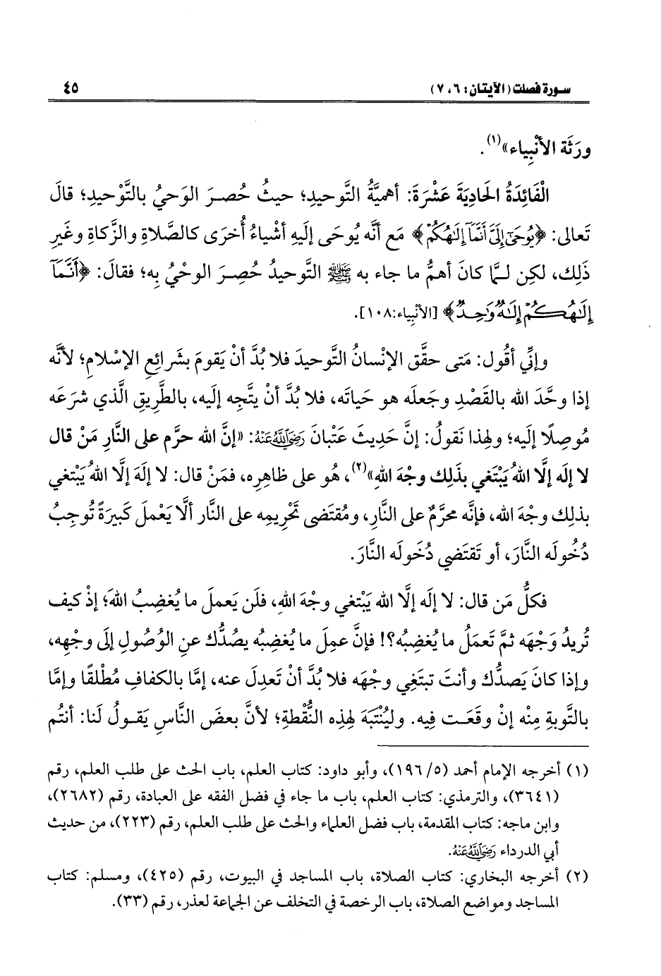 الْفَائِدَةُ الحَادِيَةَ عَشْرَةَ: أهميَّةُ التَّوحيدِ؛ حيثُ حُصرَ الوَحيُ بالتَّوْحيدِ؛ قالَ تَعالى: {يُوحَى إِلَيَّ أَنَّمَا إِلَهُكُمْ} مَع أنَّه يُوحَى إلَيهِ أشْياءُ أُخرَى كالصَّلاةِ والزَّكاةِ وغَيرِ ذَلِك، لكِن لمَّا كانَ أهمُّ ما جاء به - صلى الله عليه وسلم - التَّوحيدُ حُصِرَ الوحْيُ بِه؛ فقالَ: {أَنَّمَا إِلَهُكُمْ إِلَهٌ وَاحِدٌ} [الأنبياء: ١٠٨].