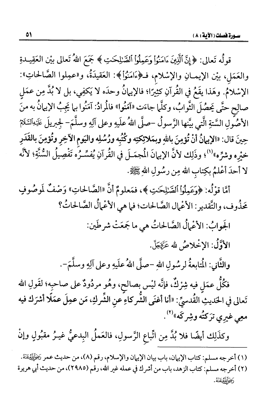 قولُه تَعالى: {إِنَّ الَّذِينَ آمَنُوا وَعَمِلُوا الصَّالِحَاتِ} جَمَعَ اللهُ تَعالى بيْن العَقِيدةِ والعَمَلِ، بيْن الإيمانِ والإسْلامِ، فـ {آمَنُوا}: العَقيدَةُ، و"عمِلوا الصَّالحاتِ": الإسْلامُ. وهَذا يقَعُ في القُرآنِ كثِيرًا؛ فالإيمانُ وحدَه لا يَكفِي، بل لا بُدَّ مِن عمَلٍ صالِحٍ حتَّى يَحصُلَ الثَّوابُ، وكلَّما جاءَت "آمَنُوا" فالمُرادُ: آمَنُوا بما يَجِبُ الإيمانُ به منَ الأصُولِ السِّتَّةِ الَّتي بيَّنها الرَّسولُ -صلَّى اللهُ علَيهِ وعلى آلِهِ وسلَّمَ- لجِبريلَ عَلَيهِ السَّلام حِينَ قال: "الإيمانُ أنْ تُؤمِنَ باللهِ وبمَلاِئكتِه وكُتُبِه ورُسُلِه واليَومِ الآخِرِ وتُؤمِنَ بالقَدَرِ خيرِه وشرِّه" (¬١)؛ وذلك لأنَّ الإيمانَ المُجمَلَ في القُرآن يُفسِّرُه تَفْصيلُ السُّنَّة؛ لأنَّه لا أحدَ أعْلمُ بكِتابِ الله مِن رسُولِ اللهِ - صلى الله عليه وسلم -.