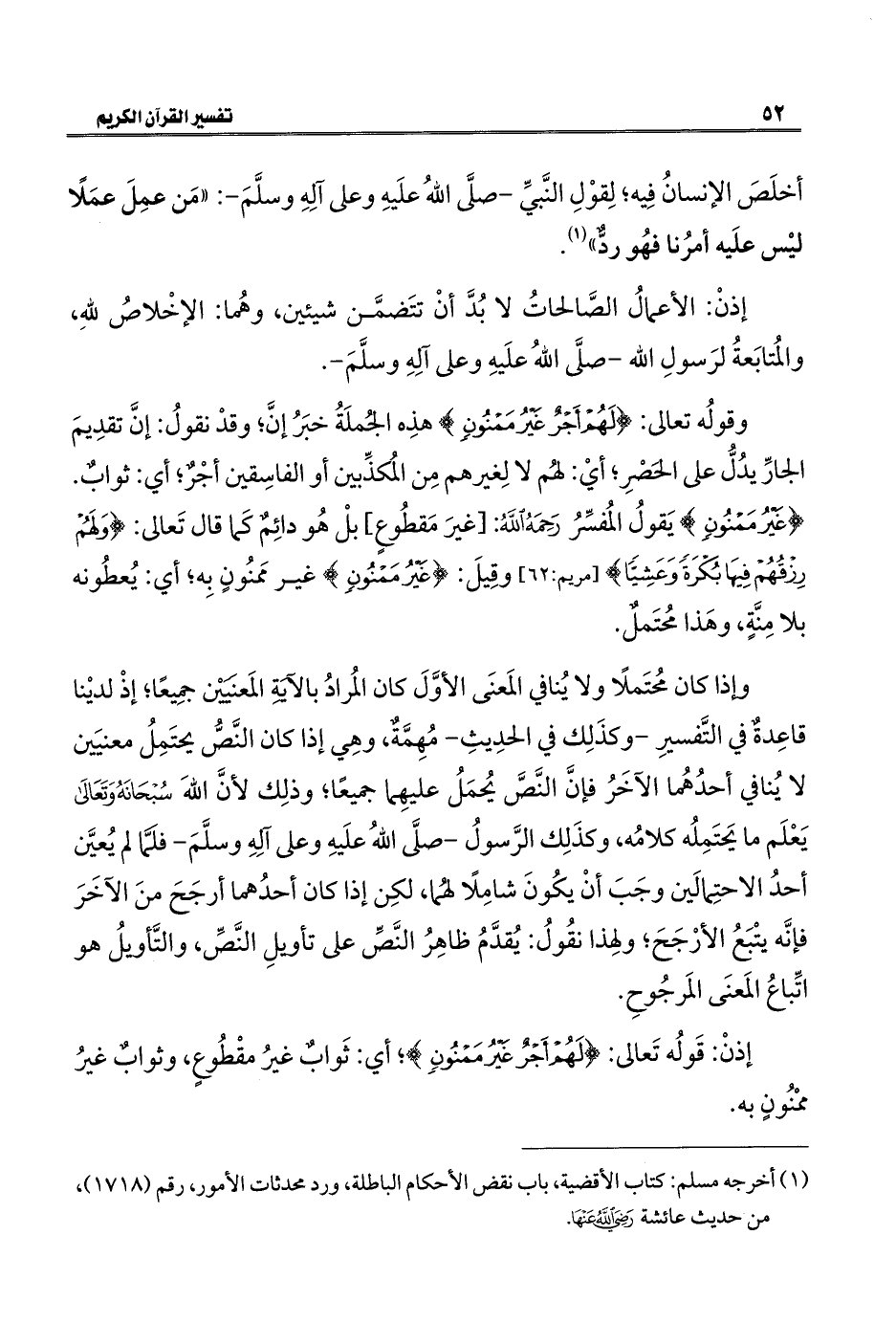 وقولُه تعالى: {لَهُمْ أَجْرٌ غَيْرُ مَمْنُونٍ} هذِه الجُملَةُ خبَرُ إنَّ؛ وقدْ نقولُ: إنَّ تقدِيمَ الجارِّ يدُلُّ على الحَصْرِ؛ أيْ: لهُم لا لِغيرهم مِن المُكذِّبين أو الفاسقين أجْرٌ؛ أي: ثوابٌ. {غَيْرُ مَمْنُونٍ} يَقولُ المُفسِّرُ رَحِمَهُ اللهُ: [غيرَ مَقطُوعٍ] بلْ هُو دائِمٌ كَما قال تَعالى: {وَلَهُمْ رِزْقُهُمْ فِيهَا بُكْرَةً وَعَشِيًّا} [مريم: ٦٢] وقِيلَ: {غَيْرُ مَمْنُونٍ} غير مَمنُونٍ بِه؛ أي: يُعطُونه بلا مِنَّةٍ، وهَذا محُتَملٌ.