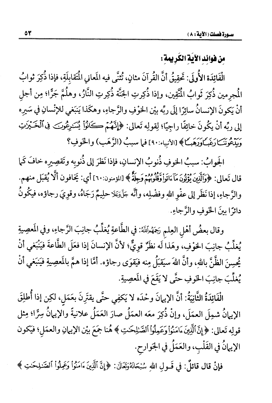 الْفَائِدَة الأُولَى: تَحقِيقُ أنَّ القُرآنَ مثانٍ، تُثنَّى فيه المَعاني المُتَقابِلَةِ، فإذا ذُكِرَ ثوابُ المُجرِمين ذُكِرَ ثَوابُ المُتَّقِين، وإذا ذُكِرتِ الجنَّة ذُكرتِ النَّارُ، وهلُمَّ جَرًّا؛ مِن أجلِ أنْ يَكونَ الإنسانُ سائِرًا إلَى ربِّه بيْن الخوْفِ والرَّجاءِ، وهكَذا يَنبَغي للإنْسانِ في سيرِه إلى ربِّه أنْ يكُونَ خائِفًا راجِيًا؛ لِقولِه تَعالى: {إِنَّهُمْ كَانُوا يُسَارِعُونَ فِي الْخَيْرَاتِ وَيَدْعُونَنَا رَغَبًا وَرَهَبًا} [الأنبياء: ٩٠]، فما سببُ (الرَّهَب) والجَوفِ؟