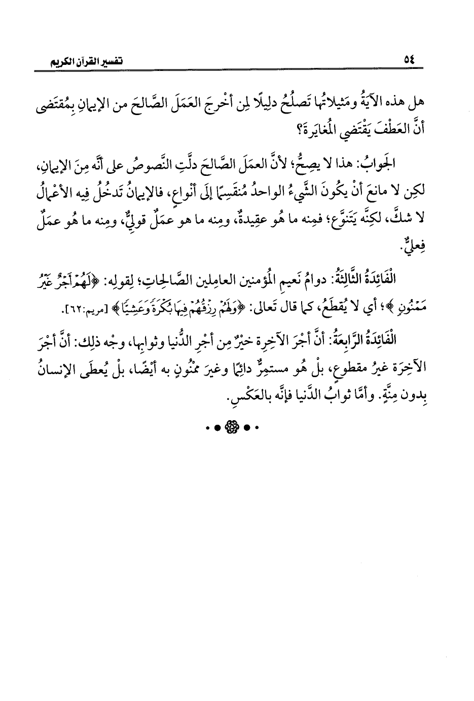 الْفَائِدَةُ الرَّابِعَةُ: أنَّ أجْرَ الآخِرِة خيْرٌ مِن أجْرِ الدُّنيا وثوابِها، وجْه ذلِك: أنَّ أجْرَ الآخِرَة غيرُ مقطوعٍ، بلْ هُو مستمِرٌّ دائِمًا وغيرَ ممْنُونٍ به أيْضا، بلْ يُعطَى الإنسانُ بِدون مِنَّةٍ. وأمَّا ثوابُ الدَّنيا فإنَّه بالعَكْسِ.