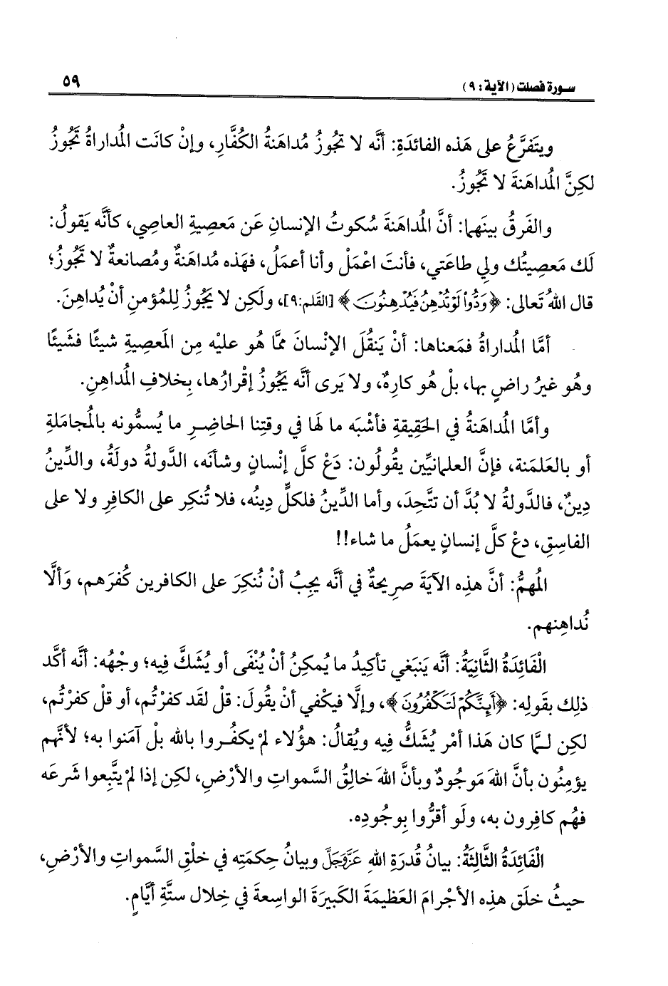 وأمَّا المُداهَنةُ في الحَقِيقةِ فأشْبَه ما لَها في وقتِنا الحاضِرِ ما يُسمُّونه بالمُجامَلةِ أو بالعَلمَنة، فإنَّ العلمانيِّين يقُولُون: دع كلَّ إنْسانٍ وشأنَه، الدَّولةُ دولَةُ، والدِّينُ دِينٌ، فالدَّولةُ لا بُدَّ أن تتَّحِدَ، وأما الدِّينُ فلكلٍّ دِينُه، فلا تُنكِر على الكافِرِ ولا على الفاسِقِ، دعْ كلَّ إنسانٍ يعمَلُ ما شاء! !