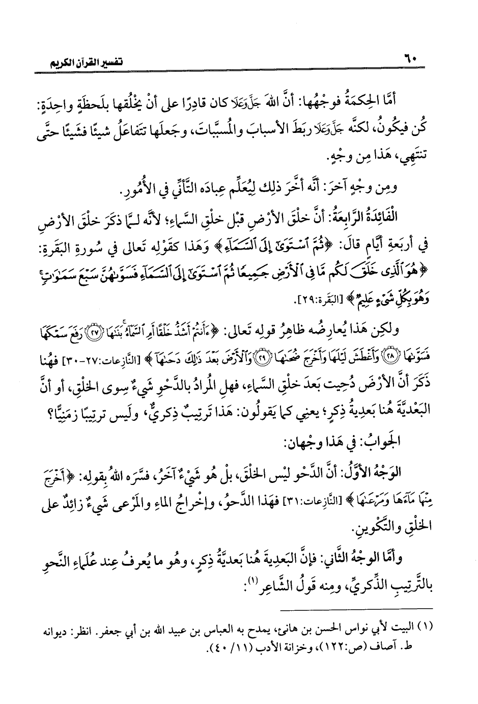 ولكِن هَذا يُعارِضُه ظاهِرُ قولِه تَعالى: {أَأَنْتُمْ أَشَدُّ خَلْقًا أَمِ السَّمَاءُ بَنَاهَا (٢٧) رَفَعَ سَمْكَهَا فَسَوَّاهَا (٢٨) وَأَغْطَشَ لَيْلَهَا وَأَخْرَجَ ضُحَاهَا (٢٩) وَالْأَرْضَ بَعْدَ ذَلِكَ دَحَاهَا} [النازعات: ٢٧ - ٣٠] فهُنا ذَكَرَ أنَّ الأرْضَ دُحِيت بَعدَ خلْقِ السَّماءِ، فهلِ المُرادُ بالدَّحْوِ شَيءٌ سِوى الخلْقِ، أو أنَّ البَعْديَّةَ هُنا بَعدِيةُ ذِكرٍ؛ يعنِي كما يَقولُون: هَذا تَرتِيبٌ ذِكري، ولَيس ترتِيبًا زمَنِيًّا؛ الجَوابُ: في هَذا وجْهان: