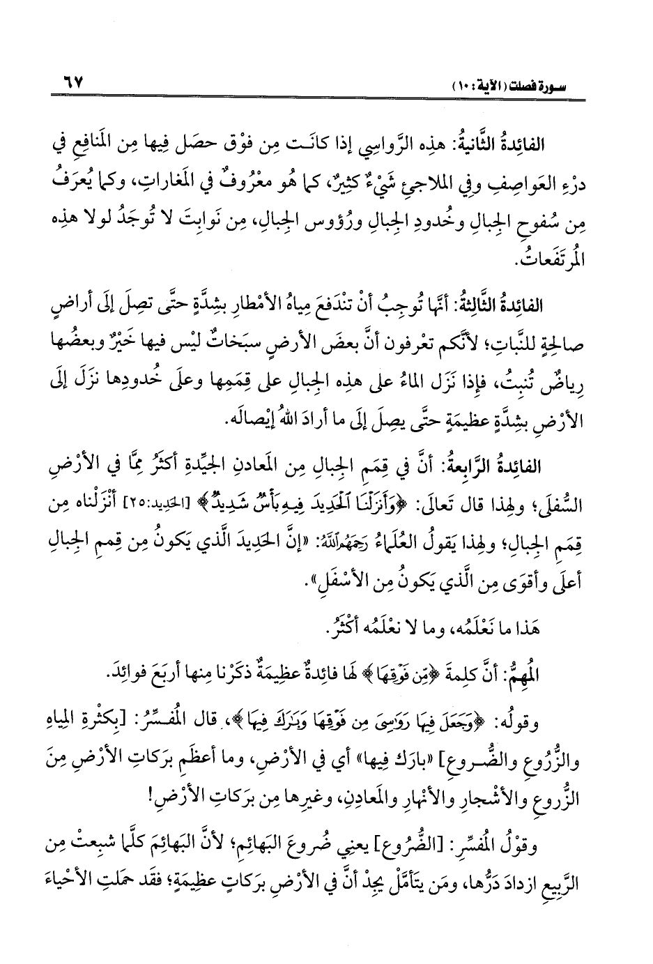 الفائِدةُ الرَّابِعةُ: أنَّ في قِمَمِ الجِبالِ مِن المَعادنِ الجيِّدةِ أكثَرُ مِمَّا في الأرْضِ السُّفلَى؛ ولهِذا قال تَعالَى: {وَأَنْزَلْنَا الْحَدِيدَ فِيهِ بَأْسٌ شَدِيدٌ} [الحديد: ٢٥]، أنْزَلْناه مِن قِمَمِ الجِبالِ؛ ولهِذا يَقولُ العُلَماءُ رَحِمَهُم اللَّهُ: "إنَّ الحدِيدَ الَّذي يَكونُ مِن قِممِ الجِبالِ أعلَى وأقوَى مِن الَّذي يَكونُ مِن الأسْفَلِ".