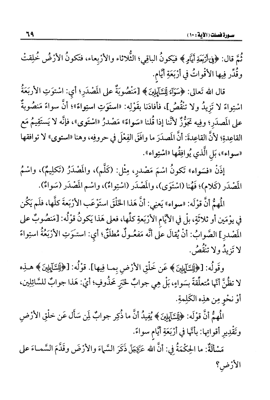 المُهمُّ أنَّ قوْلَه: "سواء" يَعنِي: أنَّ هَذا الخَلْقَ استَوْعَب الأرْبَعةَ كلَّها، فلَم يَكُن في يوْمَين أو ثلاثَةٍ، بلْ في الأَيَّامِ الأرْبَعةِ كلِّها، فعلى هَذا يَكونُ قوْلُه: [مَنصُوبٌ على المَصدرِ] الصَّوابُ: أنْ يُقالَ على أَنَّه مَفعُولٌ مُطلَق؛ أي: استَوَتِ الأرْبَعُةُ استِواءً لا تَزيدُ ولا تنْقُصُ.