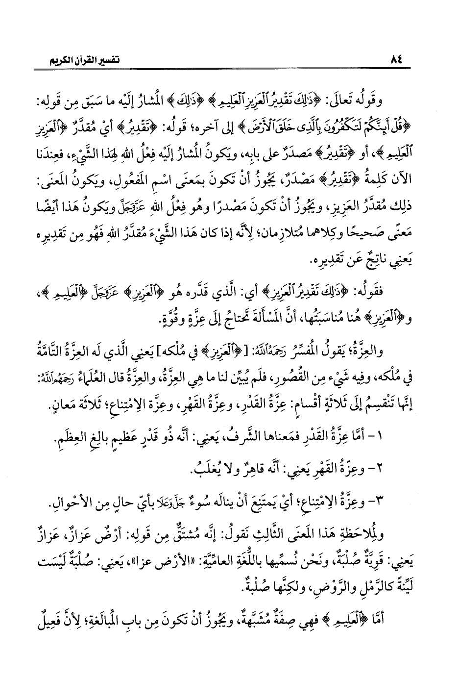 والعِزَّةُ؛ يَقولُ المُفسِّرُ رَحِمَهُ اللَّهُ: [{الْعَزِيزِ} في مُلْكه] يَعنِي الَّذي لَه العِزَّةُ التَّامَّةُ في مُلْكه، وفِيه شَيْء مِن القُصُورِ، فلَم يُبيِّن لنا ما هِي العِزَّةُ، والعِزَّةُ قال العُلَماءُ رَحِمَهُمْ اللَّهُ: إنَّها تَنْقسِمُ إلَى ثَلاثَةٍ أقْسامٍ: عِزَّةُ القَدْرِ، وعِزَّةُ القَهْرِ، وعِزَّة الِامْتِناعِ؛ ثَلاثَة مَعانٍ.