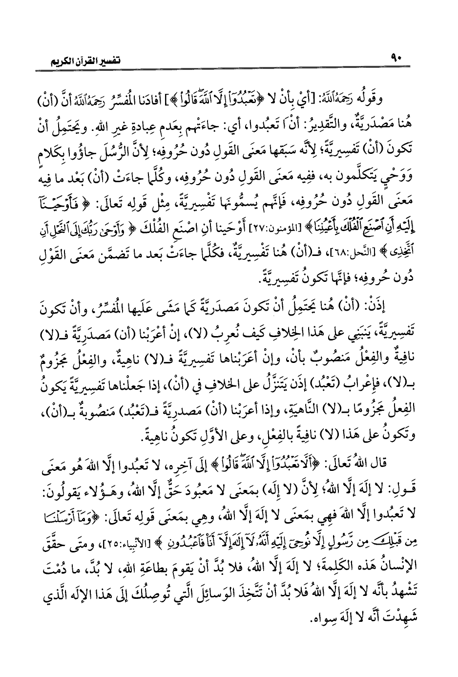 وقَولُه رَحِمَهُ اللَّهُ: [أيْ بِأنْ لا {تَعْبُدُوا إِلَّا اللَّهَ قَالُوا}، أفادَنا المُفسِّرُ رَحِمَهُ اللَّهُ أنَّ (أنْ) هُنا مَصْدَريَّة، والتَّقدِيرُ: أنْاَ تَعبُدوا، أي: جاءَتْهم بِعَدمِ عِبادةِ غيرِ اللهِ. ويَحتَمِلُ أنْ تَكُونَ (أنْ) تَفسِيريَّةً؛ لأنَّه سَبَقها مَعنَى القَولِ دُون حُرُوفِه؛ لِأنَّ الرُّسُلَ جاؤُوا بِكَلامٍ وَوَحْيٍ يَتكلَّمون به، ففِيه مَعنَى القَولِ دُون حُرُوفِه، وكُلَّما جاءَتْ (أنْ) بَعْد ما فِيه مَعنَى القَولِ دُون حُرُوفِه، فَإنَّهم يُسمُّونَها تَفْسِيريَّةً، مِثْل قَولِه تَعالَى: {فَأَوْحَيْنَا إِلَيْهِ أَنِ اصْنَعِ الْفُلْكَ بِأَعْيُنِنَا} [المؤمنون: ٢٧]، أَوْحَينا أنِ اصْنَعِ الفُلْكَ {وَأَوْحَى رَبُّكَ إِلَى النَّحْلِ أَنِ اتَّخِذِي} [النحل: ٦٨] فـ (أَنْ) هُنا تَفْسِيرَّية، فكُلَّما جاءَتْ بَعد ما تَضمَّن مَعنَى القَوْلِ دُون حُروفِه؛ فإنَّها تَكونُ تَفسِيريَّةً.