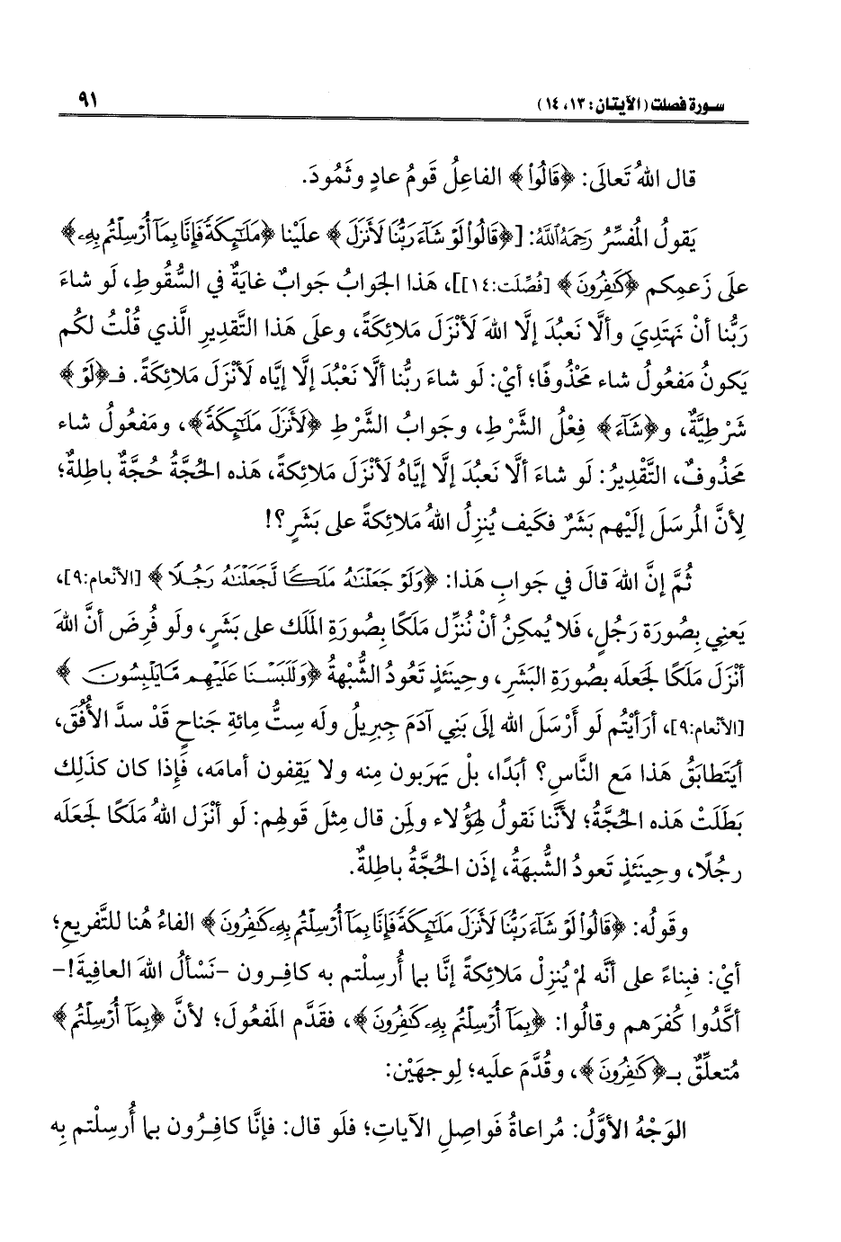 يَقولُ المُفسِّرُ رَحِمَهُ اللَّهُ: [{قَالُوا لَوْ شَاءَ رَبُّنَا لَأَنْزَلَ} علَيْنا {مَلَائِكَةً فَإِنَّا بِمَا أُرْسِلْتُمْ بِهِ} علَى زَعمِكم {كَافِرُونَ} [فُصِّلَت: ١٤]]، هَذا الجَوابُ جَوابٌ غايَةٌ في السُّقُوطِ، لَو شاءَ رَبُّنا أنْ نَهتَدِيَ وألَّا نَعبُدَ إلَّا اللهَ لَأنْزَلَ مَلائِكَةً، وعلَى هَذا التَّقدِيرِ الَّذي قُلْتُ لكُم يَكونُ مَفعُولُ شاء مَحْذُوفًا؛ أيْ: لَو شاءَ ربُّنا ألَّا نَعْبُدَ إلَّا إيَّاه لَأَنزَلَ مَلائِكَةً. ف {لَوْ} شَرْطِيَّةٌ، و {شَاءَ} فِعْلُ الشَّرْطِ، وجَوابُ الشَّرْطِ {لَأَنْزَلَ مَلَائِكَةً}، ومَفعُولُ شاء مَحذُوفٌ، التَّقْدِيرُ: لَو شاءَ ألَّا نَعبُدَ إلَّا إيَّاهُ لَأنْزَلَ مَلائِكةً، هَذه الحُجَّةُ حُجَّةٌ باطِلةٌ؛ لِأنَّ المُرسَلَ إلَيْهم بَشَرٌ فكَيف يُنزِلُ اللهُ مَلائِكةً على بَشَرٍ؟ !