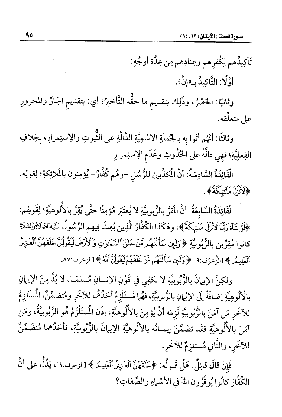الْفَائِدَةُ السَّابعَةُ: أنَّ المُقرَّ بالرُّبوبيَّةِ لا يُعتَبَر مُؤمِنًا حتَّى يُقِرَّ بالأُلوهيَّةِ؛ لِقَولهِم: {لَوْ شَاءَ رَبُّنَا لَأَنْزَلَ مَلَائِكَةً}، وهَكَذا الكُفَّارُ الَّذِين بُعِثَ فِيهم الرَّسُولُ عَلَيْهِ الصَّلَاةُ وَالسَّلَامُ كانوا مُقِرِّين بالرُّبوبيَّةِ {وَلَئِنْ سَأَلْتَهُمْ مَنْ خَلَقَ السَّمَاوَاتِ وَالْأَرْضَ لَيَقُولُنَّ خَلَقَهُنَّ الْعَزِيزُ الْعَلِيمُ} [الزخرف: ٩]، {وَلَئِنْ سَأَلْتَهُمْ مَنْ خَلَقَهُمْ لَيَقُولُنَّ اللَّه} [الزخرف: ٨٧].