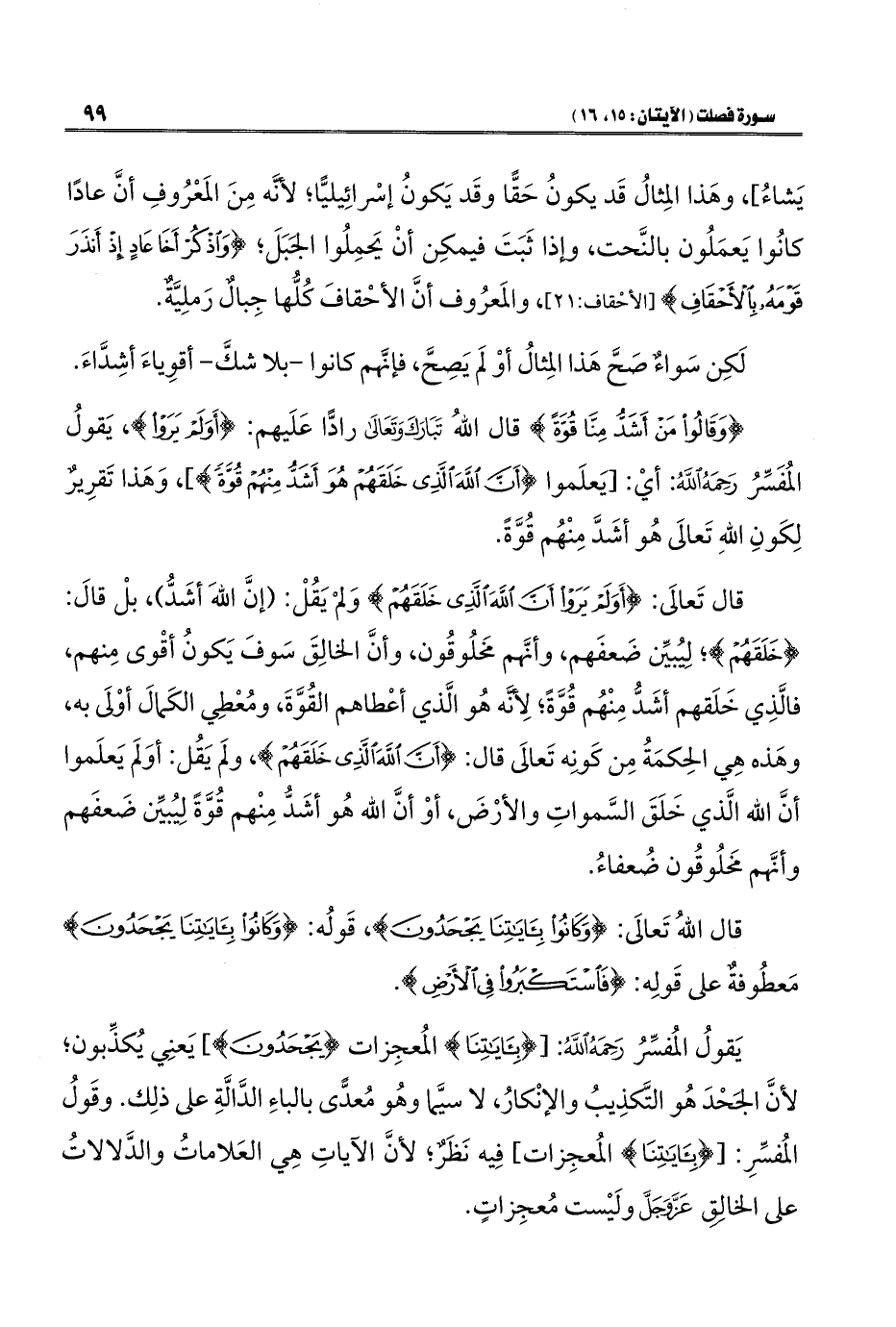 قال تَعالَى: {أَوَلَمْ يَرَوْا أَنَّ اللَّهَ الَّذِي خَلَقَهُمْ} وَلمْ يَقُلْ: (إنَّ اللهَ أشَدُّ)، بلْ قالَ: {خَلَقَهُمْ}؛ لِيُبيِّن ضَعفَهم، وأنَّهم مَخلُوقُون، وأنَّ الخالِقَ سَوفَ يَكونُ أقْوى مِنهم، فالَّذِي خَلَقهم أشَدُّ مِنْهُم قُوَّةً؛ لِأَنَّه هُو الَّذي أعْطاهم القُوَّةَ، ومُعْطِي الكَمالَ أوْلَى به، وهَذه هِي الحِكمَةُ مِن كَونِه تَعالَى قال: {أَنَّ اللَّهَ الَّذِي خَلَقَهُمْ}، ولَم يَقُل: أوَلَم يَعلَموا أنَّ الله الَّذي خَلَقَ السَّمواتِ والأرْضَ، أوْ أنَّ الله هُو أشَدُّ مِنْهم قُوَّةً لِيُبيِّن ضَعفَهم وأنَّهم مَخْلُوقُون ضُعفاءُ.