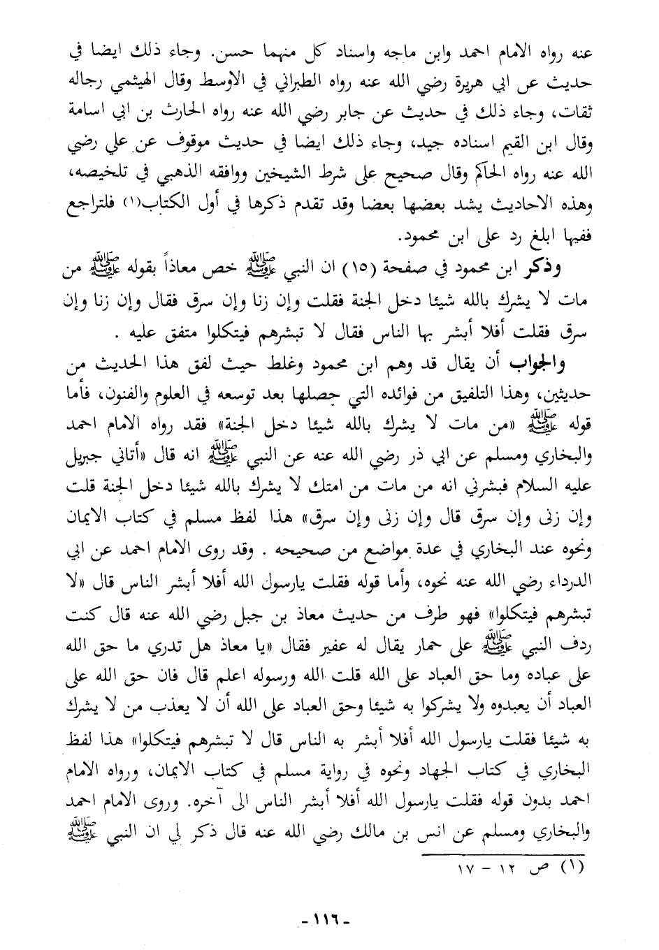 وذكر ابن محمود في صفحة (15) أن النبي - صلى الله عليه وسلم - خصَّ معاذًا بقوله - صلى الله عليه وسلم -: من مات لا يشرك بالله شيئًا دخل الجنة. فقلت: وإن زنا وإن سرق. فقال: وإن زنا وإن سرق. فقلت: أفلا أبشر بها الناس؟ فقال: لا تبشرهم فيتكلوا. متفق عليه.