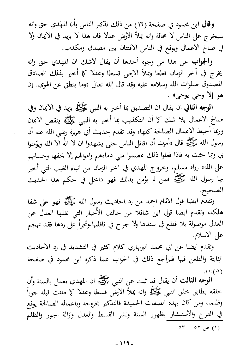 وقال ابن محمود في صفحة (16): "من ذلك تذكير الناس بأن المهدي حق، وأنه سيخرج على الناس لا محالة، وأنه يملأ الأرض عدلا، فإن هذا لا يزيد في الإيمان ولا في صالح الأعمال، ويوقع في الناس الافتتان بين مصدق ومكذب".