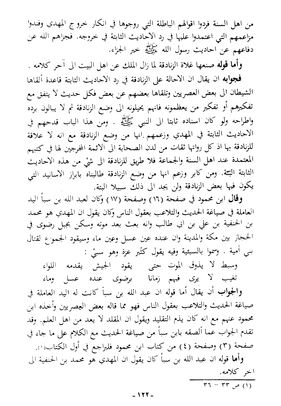 وقال ابن محمود في صفحة (16) وصفحة (17): "وكان لعبد الله بن سبأ اليد العاملة في صياغة الحديث والتلاعب بعقول الناس، وكان يقول إن المهدي هو محمد بن الحنفية بن علي بن أبي طالب، وإنه بعث بعد موته، وسكن بجبل رضوى في الحجاز بين مكة والمدينة، وأن عنده عين عسل وعين ماء، وسيقود الجموع لقتال بني أمية، وسموا بالسبئية، وفيه يقول كُثير عزة وهو سبئي: