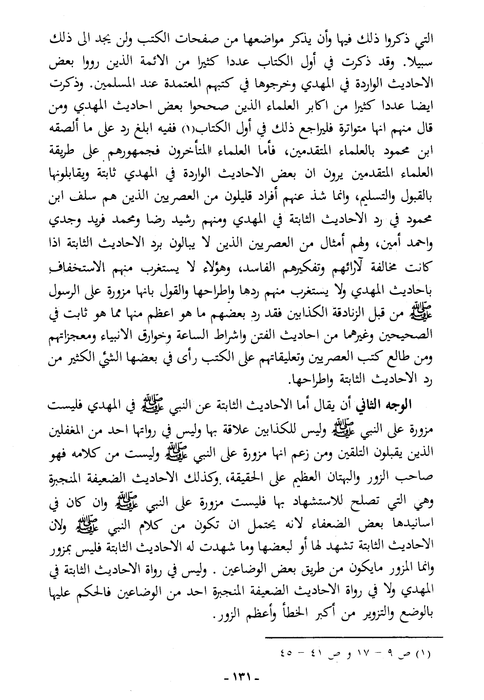 الوجه الثاني: أن يقال: أما الأحاديث الثابتة عن النبي - صلى الله عليه وسلم - في المهدي فليست مزورة على النبي - صلى الله عليه وسلم -، وليس للكذابين علاقة بها، وليس في رواتها أحد من المغفلين الذين يقبلون التلقين، ومن زعم أنها مزورة على النبي - صلى الله عليه وسلم - وليست من كلامه فهو صاحب الزور والبهتان العظيم على الحقيقة، وكذلك الأحاديث الضعيفة المنجبرة وهي التي تصلح للاستشهاد بها، فليست مزورة على النبي - صلى الله عليه وسلم - وإن كان في أسانيدها بعض الضعفاء؛ لأنه يحتمل أن تكون من كلام النبي - صلى الله عليه وسلم -، ولأن الأحاديث الثابتة تشهد لها أو لبعضها، وما شهدت له الأحاديث الثابتة فليس بمزور، وإنما المزور ما يكون من طريق بعض الوضاعين، وليس في رواة الأحاديث الثابتة في المهدي ولا في رواة الأحاديث الضعيفة المنجبرة أحد من الوضاعين، فالحكم عليها بالوضع والتزوير من أكبر الخطأ وأعظم الزور.