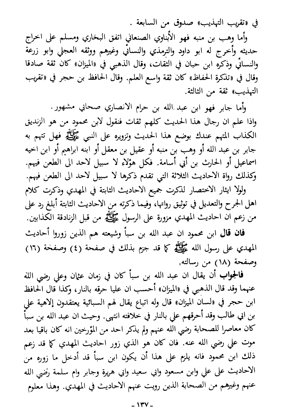 فالجواب: أن يقال: إن عبد الله بن سبأ كان في زمان عثمان وعلي -رضي الله عنهما- وقد قال الذهبي في "الميزان": "أحسب أن عليًا حرقه بالنار"، وكذا قال الحافظ ابن حجر في "لسان الميزان" قال: "وله أتباع يقال لهم السبائية، يعتقدون إلاهية علي بن أبي طالب، وقد أحرقهم علي بالنار في خلافته". انتهى. وحيث أن عبد الله بن سبأ كان معاصرًا للصحابة -رضي الله عنهم- ولم يذكر أحد من المؤرخين أنه كان باقيًا بعد موت علي -رضي الله عنه-، فإن كان هو الذي زوَّر أحاديث المهدي كما قد زعم ذلك ابن محمود، فإنه يلزم على هذا أن يكون ابن سبأ قد أدخل ما زوره من الأحاديث على عليٍّ وابن مسعود وأبي سعيد وأبي هريرة وجابر وأم سلمة -رضي الله عنهم- وغيرهم من الصحابة الذين رويت عنهم الأحاديث في المهدي، وهذا معلوم ..............................................