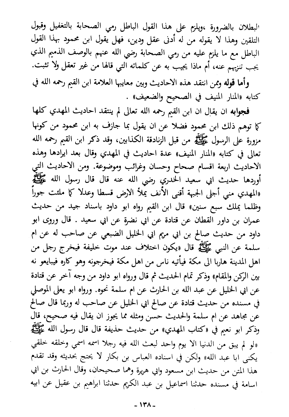 فجوابه: أن يقال: إن ابن القيم -رحمه الله تعالى- لم ينتقد أحاديث المهدي كلها كما توهم ذلك ابن محمود، فضلا عن أن يقول بما جازف به ابن محمود من كونها مزورة على الرسول - صلى الله عليه وسلم - من قبل الزنادقة الكذابين، وقد ذكر ابن القيم -رحمه الله تعالى- في كتابه "المنار المنيف" عدة أحاديث في المهدي، وقال بعد إيرادها: "وهذه الأحاديث أربعة أقسام؛ صحاح وحسان وغرائب وموضوعة"، ومن الأحاديث التي أوردها حديث أبي سعيد الخدري -رضي الله عنه- قال: قال رسول الله - صلى الله عليه وسلم -: «المهدي مِنِّي، أجلى الجبهة، أقنى الأنف، يملأ الأرض قسطًا وعدلا كما ملئت جورًا وظلمًا، يملك سبع سنين». قال ابن القيم: "رواه أبو داود بإسناد جيد من حديث عمران بن داور القطان، عن قتادة عن أبي نضرة عن أبي سعيد".