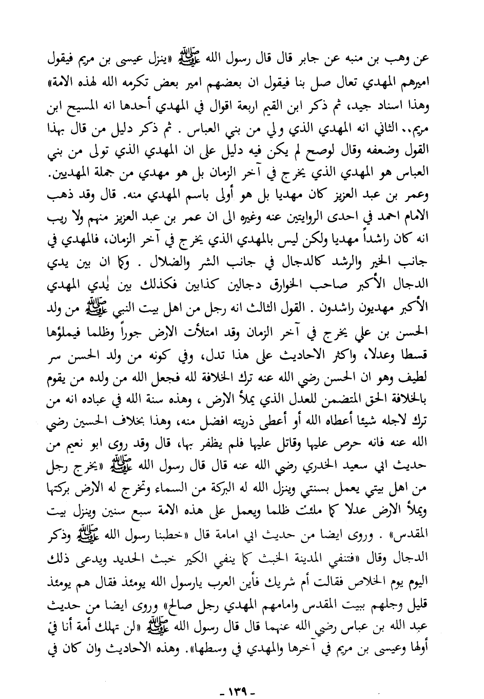 ثم ذكر ابن القيم أربعة أقوال في المهدي؛ أحدها: أنه المسيح ابن مريم ... الثاني: أنه المهدي الذي ولي من بني العباس ثم ذكر دليل من قال بهذا القول وضعَّفه، وقال: لو صح لم يكن فيه دليل على أن المهدي الذي تولى من بني العباس هو المهدي الذي يخرج في آخر الزمان، بل هو مهدي من جملة المهديين، وعمر بن عبد العزيز كان مهديًا، بل هو أولى باسم المهدي منه.