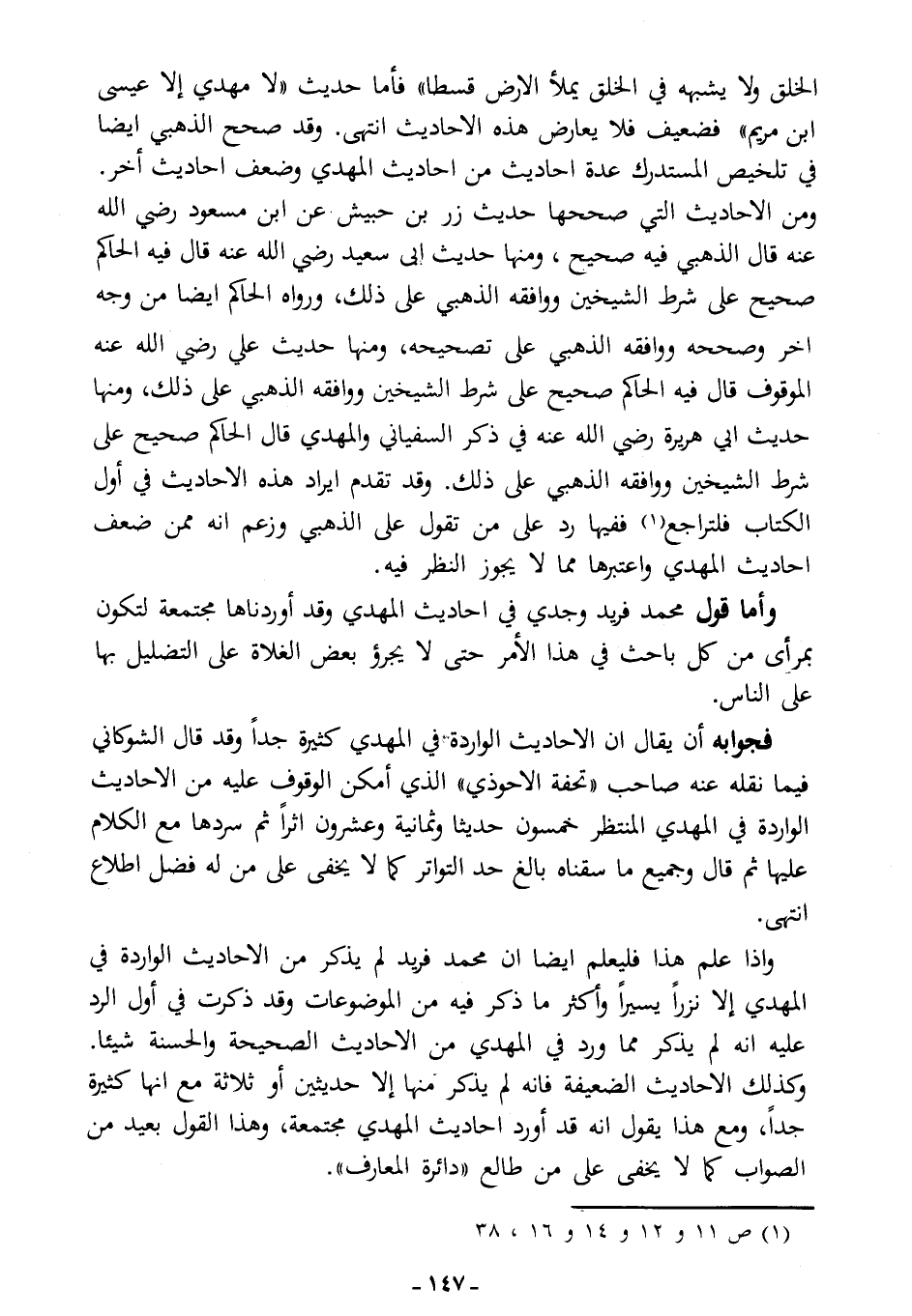 وأما قول محمد فريد وجدي في أحاديث المهدي: وقد أوردناها مجتمعة لتكون بمرأى من كل باحث في هذا الأمر، حتى لا يجرؤ بعض الغلاة على التضليل بها على الناس.