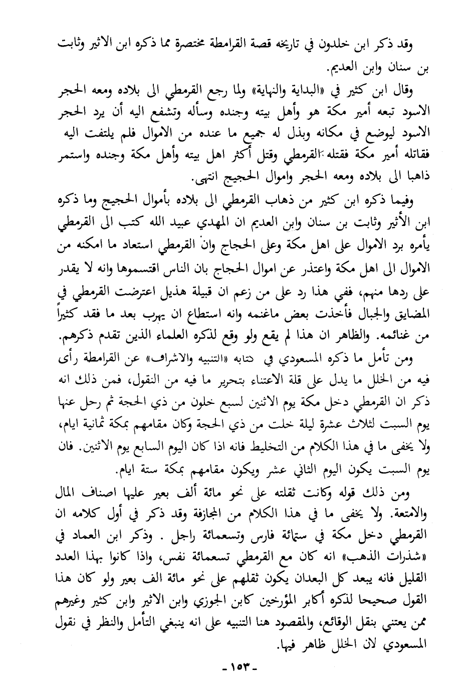ومن ذلك قوله: وكانت ثقلته على نحو مائة ألف بعير، عليها أصناف المال والأمتعة. ولا يخفى ما في هذا الكلام من المجازفة، وقد ذكر في أول كلامه أن القرمطي دخل مكة في ستمائة فارس وتسعمائة راجل، وذكر ابن العماد في "شذرات الذهب" أنه كان مع القرمطي تسعمائة نفس، وإذا كانوا بهذا العدد القليل فإنه يبعد كل البعد أن يكون ثقلهم على نحو مائة ألف بعير، ولو كان هذا القول صحيحًا لذكره أكابر المؤرخين؛ كابن الجوزي، وابن الأثير، وابن كثير، وغيرهم ممن يعتني بنقل الوقائع، والمقصود هنا التنبيه على أنه ينبغي التأمل والنظر في نقول المسعودي؛ لأن الخلل ظاهر فيها.