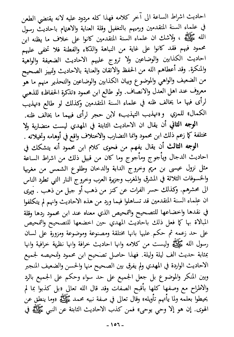 الوجه الثالث: أن يقال: يفهم من فحوى كلام ابن محمود أنه يتشكك في أحاديث الدجال، ويأجوج ومأجوج، وما كان من قبيل ذلك من أشراط الساعة؛ مثل نزول عيسى ابن مريم، وخروج الدابة، والدخان، وطلوع الشمس من مغربها، والخسوفات الثلاثة في المشرق والمغرب وجزيرة العرب، وخروج النار التي تطرد الناس إلى محشرهم، وكذلك حسر الفرات عن كنز من ذهب أو جبل من ذهب، ويرى أن علماء السنة المتقدمين قد تساهلوا فيما ورد من هذه الأحاديث، وأنهم لم يتكلفوا في نقدها وإخضاعها للتصحيح والتمحيص، الذي معناه عند ابن محمود ردها وقلة المبالاة بها، كما فعل ذلك بأحاديث المهدي حين أخضعها للتصحيح والتمحيص على حد زعمه، ثم حكم عليها بأنها مختلقة ومصنوعة وموضوعة ومزورة على لسان رسول الله - صلى الله عليه وسلم - وليست من كلامه، وأنها أحاديث خرافة، وأنها نظرية خرافية، وأنها بمثابة حديث ألف ليلة وليلة، فهذا حاصل تصحيح ابن محمود وتمحيصه لجميع الأحاديث الواردة في المهدي، ولم يفرق بين الصحيح منها والحسن والضعيف المنجبر، وبين المنكر والموضوع، بل جعل الجميع على حد سواء، وحكم على الجميع بالرد والإطراح، مع وصفها كلها بأقبح الصفات، وقد قال الله -تعالى-: {بَلْ كَذَّبُوا بِمَا لَمْ يُحِيطُوا بِعِلْمِهِ وَلَمَّا يَأْتِهِمْ تَأْوِيلُهُ}، وقال -تعالى- في صفة نبيه محمد - صلى الله عليه وسلم -: {وَمَا يَنْطِقُ عَنِ الْهَوَى * إِنْ هُوَ إِلَّا وَحْيٌ يُوحَى}. فمن كذَّب الأحاديث الثابتة عن النبي - صلى الله عليه وسلم - في ...........