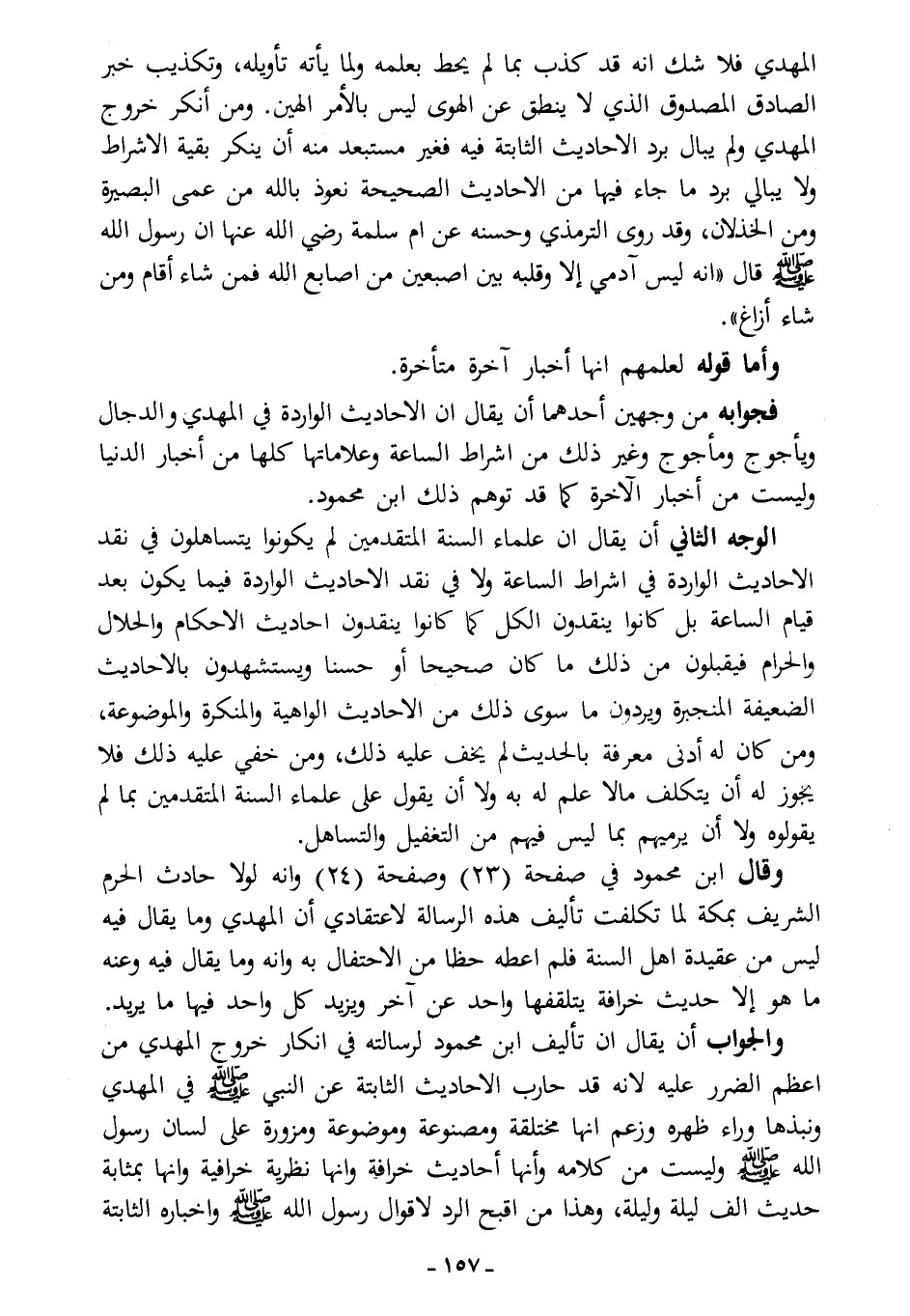 وقال ابن محمود في صفحة (23) وصفحة (24): "وإنه لولا حادث الحرم الشريف بمكة لما تكلفت تأليف هذه الرسالة، لاعتقادي أن المهدي وما يقال فيه ليس من عقيدة أهل السنة، فلم أعطه حظًا من الاحتفال به، وإنه وما يقال فيه وعنه ما هو إلا حديث خرافة يتلقفها واحد عن آخر، ويزيد كل واحد فيها ما يريد".