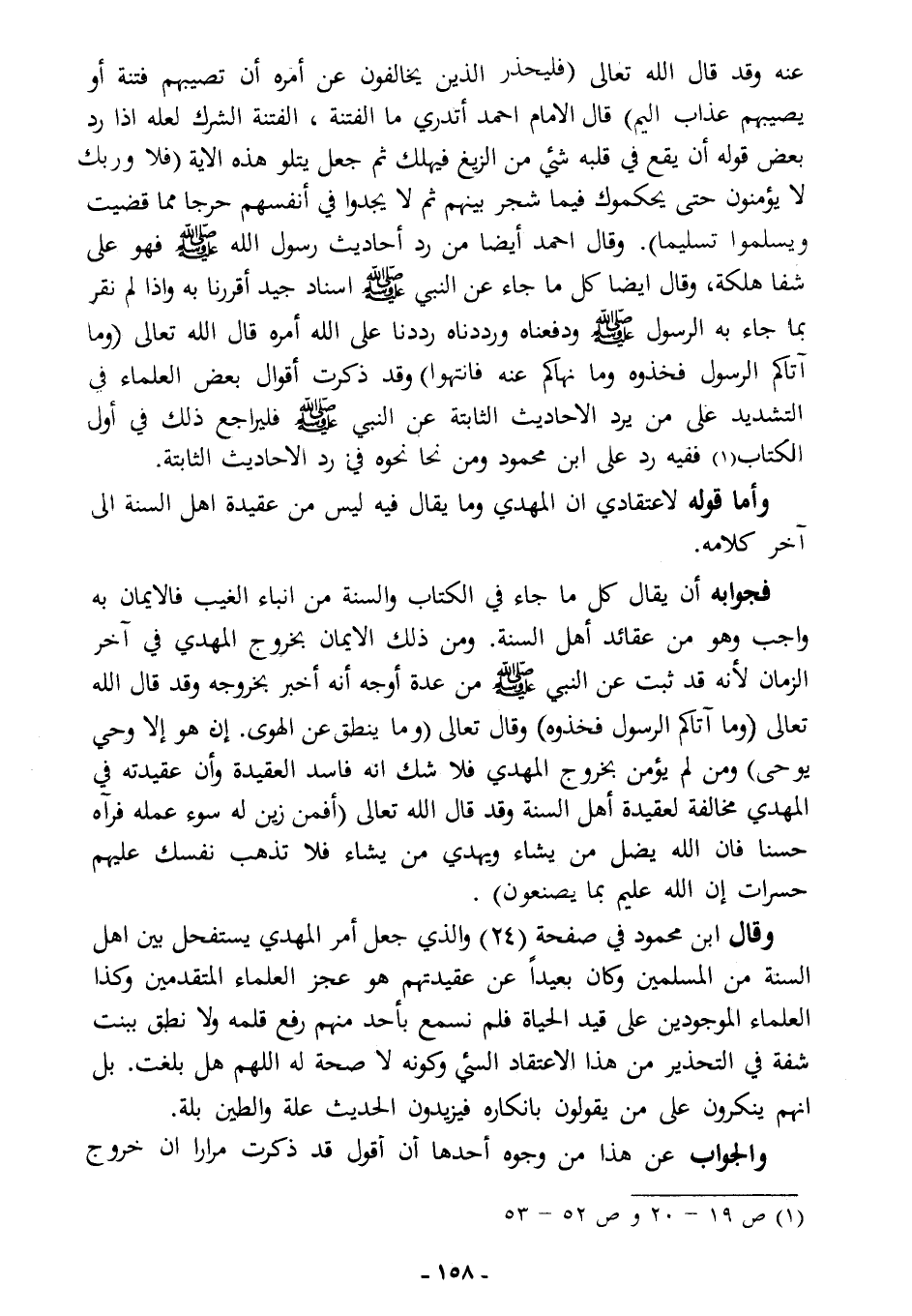 وقال ابن محمود في صفحة (24): "والذي جعل أمر المهدي يستفحل بين أهل السنة من المسلمين وكان بعيدًا عن عقيدتهم، هو عجز العلماء المتقدمين وكذا العلماء الموجودين على قيد الحياة، فلم نسمع بأحد منهم رفع قلمه، ولا نطق ببنت شفة في التحذير من هذا الاعتقاد السيئ، وكونه لا صحة له، اللهم هل بلغت؟ بل إنهم ينكرون على من يقولون بإنكاره، فيزيدون الحديث علة والطين بلة".