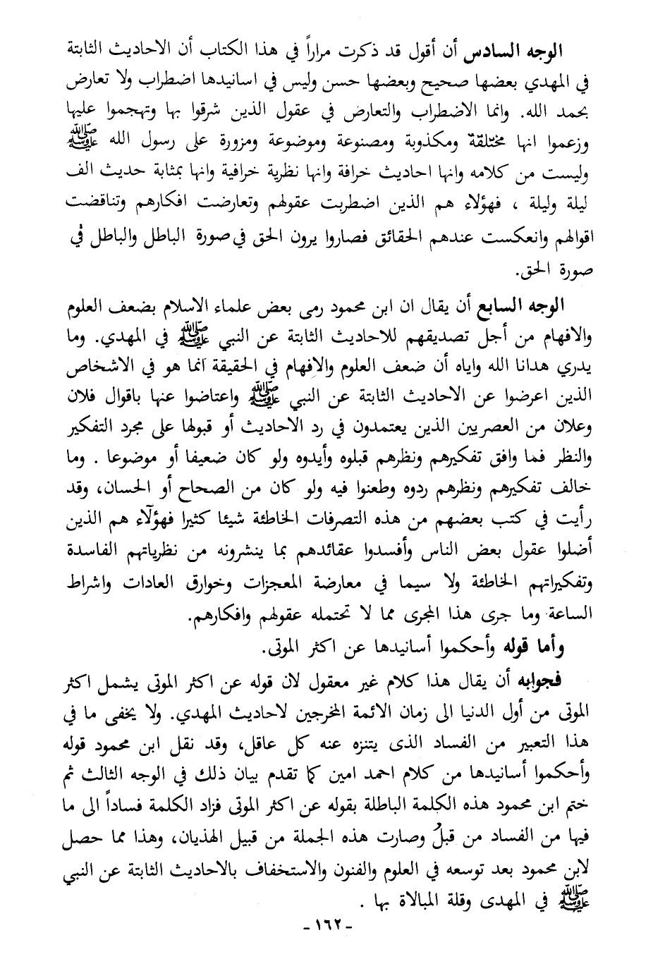 فجوابه: أن يقال: هذا كلام غير معقول؛ لأن قوله عن أكثر الموتى يشمل أكثر الموتى من أول الدنيا إلى زمان الأئمة المخرجين لأحاديث المهدي، ولا يخفى ما في هذا التعبير من الفساد الذي يتنزه عنه كل عاقل، وقد نقل ابن محمود قوله: وأحكموا أسانيدها ... من كلام أحمد أمين، كما تقدم بيان ذلك في الوجه الثالث، ثم ختم ابن محمود هذه الكلمة الباطلة بقوله عن أكثر الموتى، فزاد الكلمة فسادًا إلى ما فيها من الفساد من قبلُ، وصارت هذه الجملة من قبيل الهذيان، وهذا مما حصل لابن محمود بعد توسعه في العلوم والفنون، والاستخفاف بالأحاديث الثابتة عن النبي - صلى الله عليه وسلم - في المهدي، وقلة المبالاة بها.