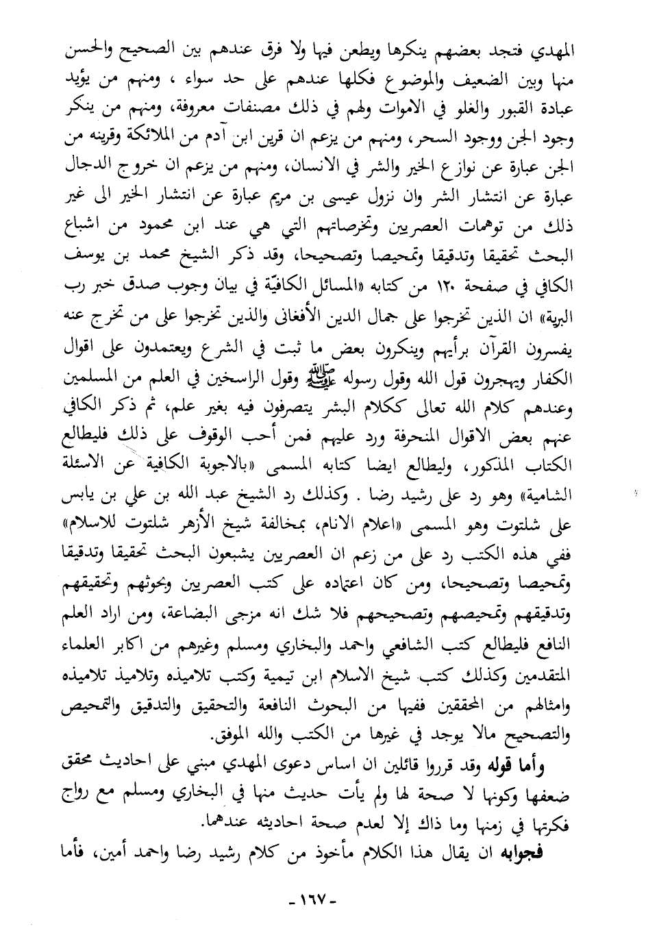 المهدي فتجد بعضهم ينكرها ويطعن فيها، ولا فرق عندهم بين الصحيح والحسن منها، وبين الضعيف والموضوع، فكلها عندهم على حد سواء، ومنهم من يؤيد عبادة القبور والغلو في الأموات، ولهم في ذلك مصنفات معروفة، ومنهم من ينكر وجود الجن ووجود السحر، ومنهم من يزعم أن قرين ابن آدم من الملائكة وقرينه من الجن عبارة عن نوازع الخير والشر في الإنسان، ومنهم من يزعم أن خروج الدجال عبارة عن انتشار الشر، وأن نزول عيسى ابن مريم عبارة عن انتشار الخير، إلى غير ذلك من توهمات العصريين وتخرصاتهم، التي هي عند ابن محمود من إشباع البحث تحقيقًا وتدقيقًا وتمحيصًا وتصحيحًا، وقد ذكر الشيخ محمد بن يوسف الكافي في صفحة (120) من كتابه "المسائل الكافية في بيان وجوب صدق خبر رب البرية" أن الذين خرجوا على جمال الدين الأفغاني والذين تخرجوا على من تخرج عنه يفسرون القرآن برأيهم، وينكرون بعض ما ثبت في الشرع، ويعتمدون على أقوال الكفار، ويهجرون قول الله وقول رسول الله - صلى الله عليه وسلم -، وقول الراسخين في العلم من المسلمين، وعندهم كلام الله -تعالى- ككلام البشر يتصرفون فيه بغير علم، ثم ذكر الكافي عنهم بعض الأقوال المنحرفة ورد عليهم، فمن أحب الوقوف على ذلك فليطالع الكتاب المذكور، وليطالع أيضًا كتابه المسمى "بالأجوبة الكافية عن الأسئلة الشامية" وهو رد على رشيد رضا، وكذلك رد الشيخ عبد الله بن علي بن يابس علي شلتوت وهو المسمى "إعلام الأنام بمخالفة شيخ الأزهر شلتوت للإسلام"، ففي هذه الكتب رد على من زعم أن العصريين يشبعون البحث تحقيقًا وتدقيقًا وتمحيصًا وتصحيحا، ومن كان اعتماده على كتب العصريين وبحوثهم وتحقيقهم وتدقيقهم وتمحيصهم وتصحيحهم فلا شك أنه مزجى البضاعة، ومن أراد العلم النافع فليطالع كتب الشافعي وأحمد والبخاري ومسلم وغيرهم من أكابر العلماء المتقدمين، وكذلك كتب شيخ الإسلام ابن تيمية، وكتب تلاميذه وتلاميذ تلاميذه وأمثالهم من المحققين، ففيها من البحوث النافعة والتحقيق والتدقيق والتمحيص والتصحيح ما لا يوجد في غيرها من الكتب، والله الموفق.