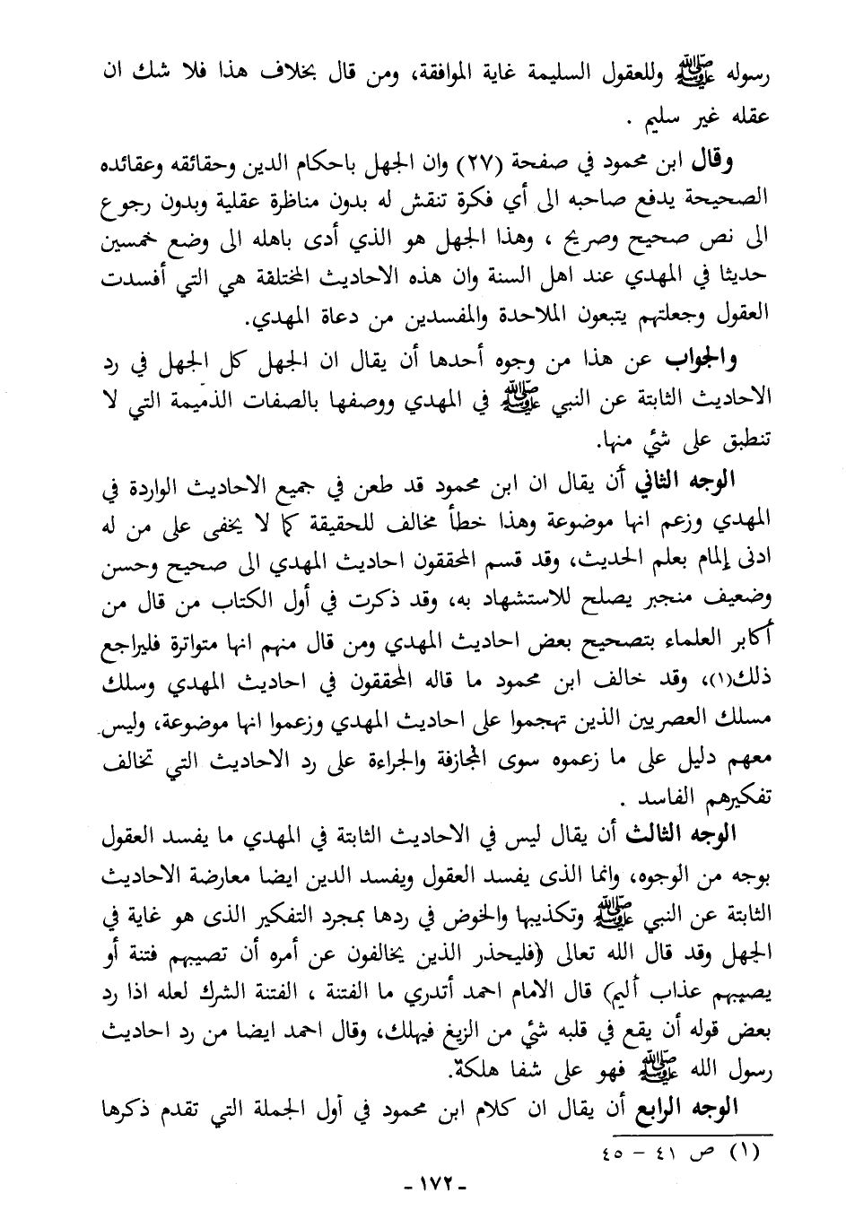 وقال ابن محمود في صفحة (27): "وإن الجهل بأحكام الدين وحقائقه وعقائده الصحيحة يدفع صاحبه إلى أي فكرة تنقش له بدون مناظرة عقلية، وبدون رجوع إلى نص صحيح وصريح، وهذا الجهل هو الذي أدَّى بأهله إلى وضع خمسين حديثًا في المهدي عند أهل السنة، وإن هذه الأحاديث المختلفة هي التي أفسدت العقول، وجعلتهم يتبعون الملاحدة والمفسدين من دعاة المهدي".